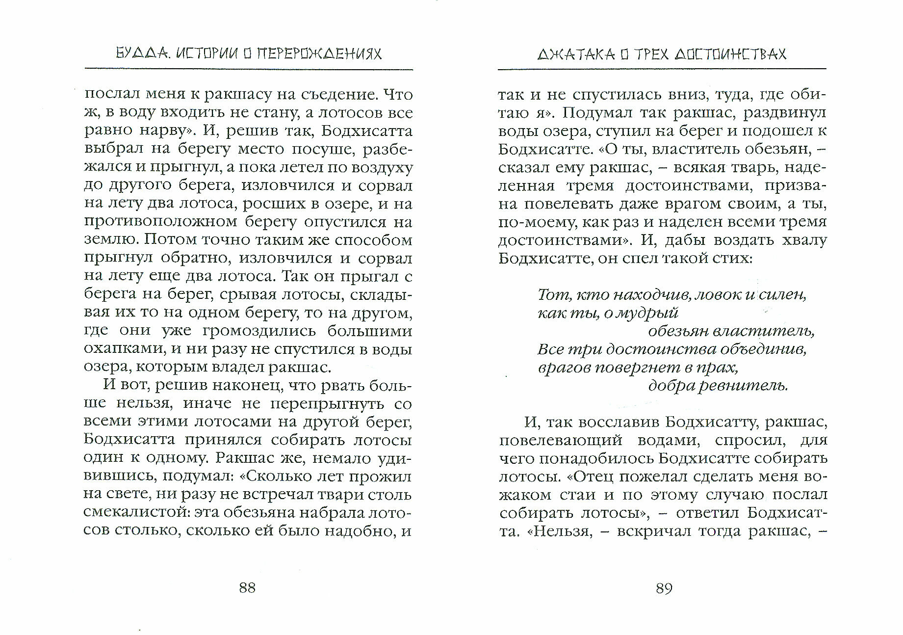 "Истории о перерождениях", или джатаки, представляют собой жития Бодхисатт, припоминаемые и излагаемые Буддой с целью нравственного наставления слушателей. Созданные еще в IV-III вв. до н. э., они доносят до нас в яркой, занимательной форме морально-этические нормы буддизма и до сих пор вызывают живой интерес читателей во всем мире.