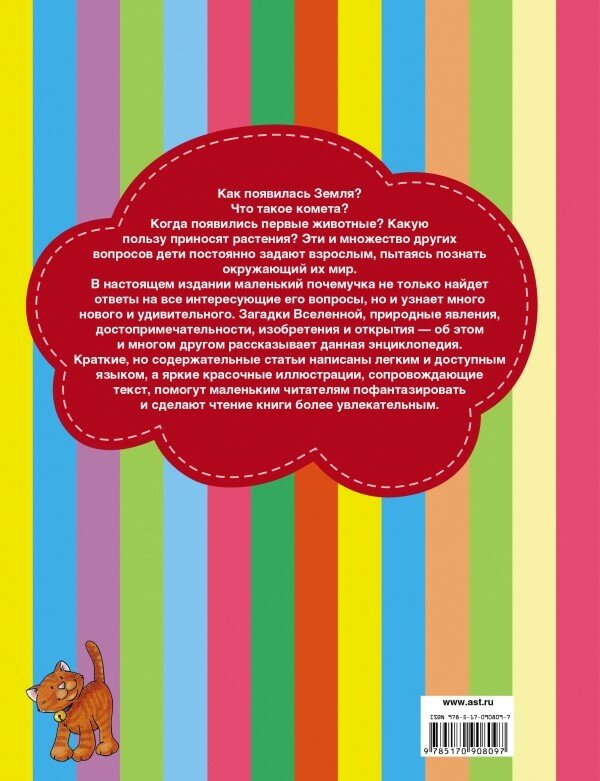 Как появилась Земля? Что такое комета? Когда появились первые животные? Какую пользу приносят растения? Эти и множество других вопросов дети постоянно задают взрослым, пытаясь познать окружающий их мир. В настоящем издании маленький «почемучка» не только найдет ответы на все интересующие его вопросы, но и узнает много нового и удивительного. Загадки Вселенной, природные явления, достопримечательности, изобретения и открытия - об этом и многом другом рассказывает данная энциклопедия. Краткие, но содержательные статьи написаны легким и доступным языком, а яркие красочные иллюстрации, сопровождающие текст, помогут маленьким читателям пофантазировать и сделают чтение книги более увлекательным.