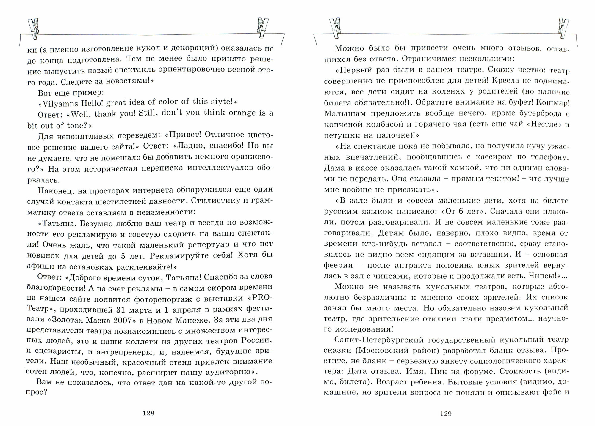 Есть фрагменты, которые я даже зачитывала вслух, пересказывала близким. Факты незатертые, наблюдения по- настоящему интересные, тонкие. Мнение репортёра, который всю творческую жизнь посвятил кукольному театру, безусловно ценно, но... Не самый продуктивный случай- оказаться на одной волне. Я в миноре, и автор в миноре. И общий тон- человека, уставшего от несуразностей- огорчает. А хотелось в "мир кулис"...
