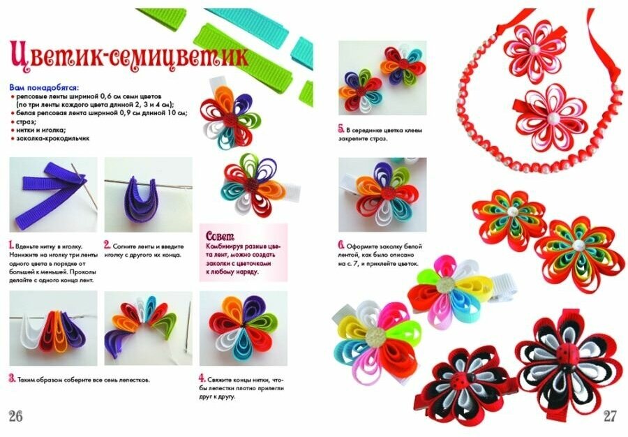 Замечательная! Замечательная!Замечательная книга! Очень рекомендую! И мамам и дочкам будет интересно посидеть и сделать такие необычные и веселые заколки своими руками. Пошаговая инструкция, все очень понятно, подробно и наглядно: что, чего и сколько взять, к чему приложить, от чего отрезать. А всего то и надо: пара-тройка ярких репсовых кусочков ленты, клей, крокодильчик и ножницы + безграничная фантазия и ваше хорошее настроение )))Книга из разряда: веселая, простая и понятная. А в результате у вас получится восхитительная прелесть своими руками! Рекомендую.