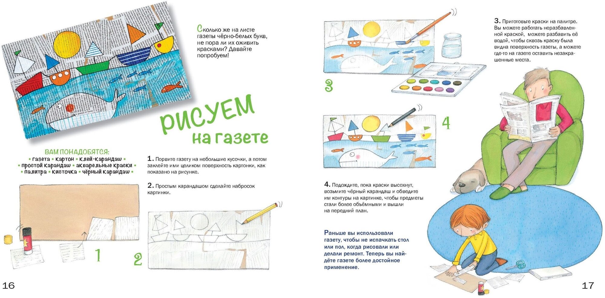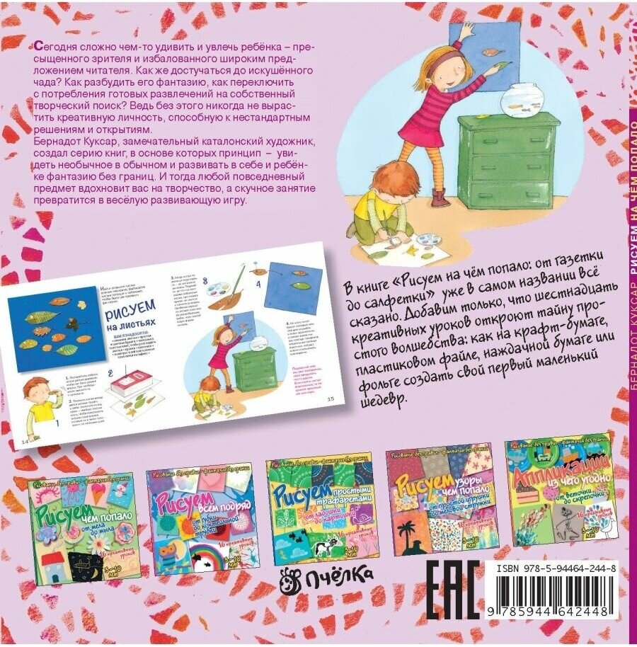 Сегодня сложно чем-то удивить и увлечь ребёнка - пресыщенного зрителя и избалованного широким предложением читателя. Как же достучаться до искушённого чада? Как разбудить его фантазию, как переключить с потребления готовых развлечений на собственный творческий поиск? Ведь без этого никогда не вырастить креативную личность, способную к нестандартным решениям и открытиям. Бернадот Куксар, замечательный каталонский художник, создал серию книг, в основе которых принцип - увидеть необычное в обычном и развивать в себе и ребёнке фантазию без границ. И тогда любой повседневный предмет вдохновит вас на творчество, а скучное занятие превратится в весёлую развивающую игру. В книге "Рисуем на чём попало: от газетки до салфетки" уже в самом названии всё сказано. Добавим только, что шестнадцать креативных уроков откроют тайну простого волшебства: как на крафт-бумаге, пластиковом файле, наждачной бумаге или фольге создать свой первый маленький шедевр.