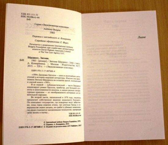 Большое спасибо любимому издательству АСТ за печать этого романа! Давно мечтала его прочитать. Книга малоизвестная, является как бы своим видением романа Оруэлла 1984. Для любителей Берджесса и Оруэлла.