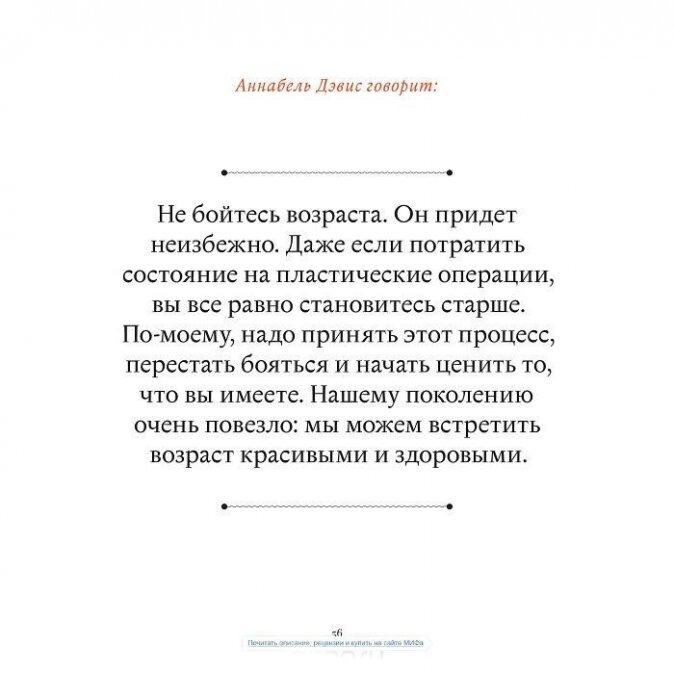 Многие герои и героини книги никогда не были у пластического хирурга, пользуются минимумом косметики и даже не закрашивают седину. И все равно выглядят превосходно. Ухоженные, полные энергии и счастливые, они знают: красота - это выбор, бодрость духа - это личная заслуга, хорошая физическая форма - результат усилий. Но какой потрясающий результат!