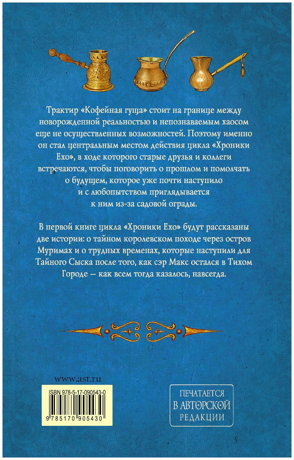 Трактир "Кофейная гуща" стоит на границе между новорожденной реальностью и непознаваемым хаосом ещё неосуществлённых возможностей. Поэтому именно он стал центральным местом действия цикла "Хроники Ехо", в ходе которого старые друзья и коллеги встречаются, чтобы поговорить о прошлом и помолчать о будущем, которое уже почти наступило и с любопытством приглядывается к ним из-за садовой ограды. В первой книге цикла "Хроники Ехо" будут рассказаны две истории: о тайном королевском походе через остров Муримах и о трудных временах, которые наступили для Тайного Сыска после того, как сэр Макс остался в Тихом Городе – как всем тогда казалось, навсегда.