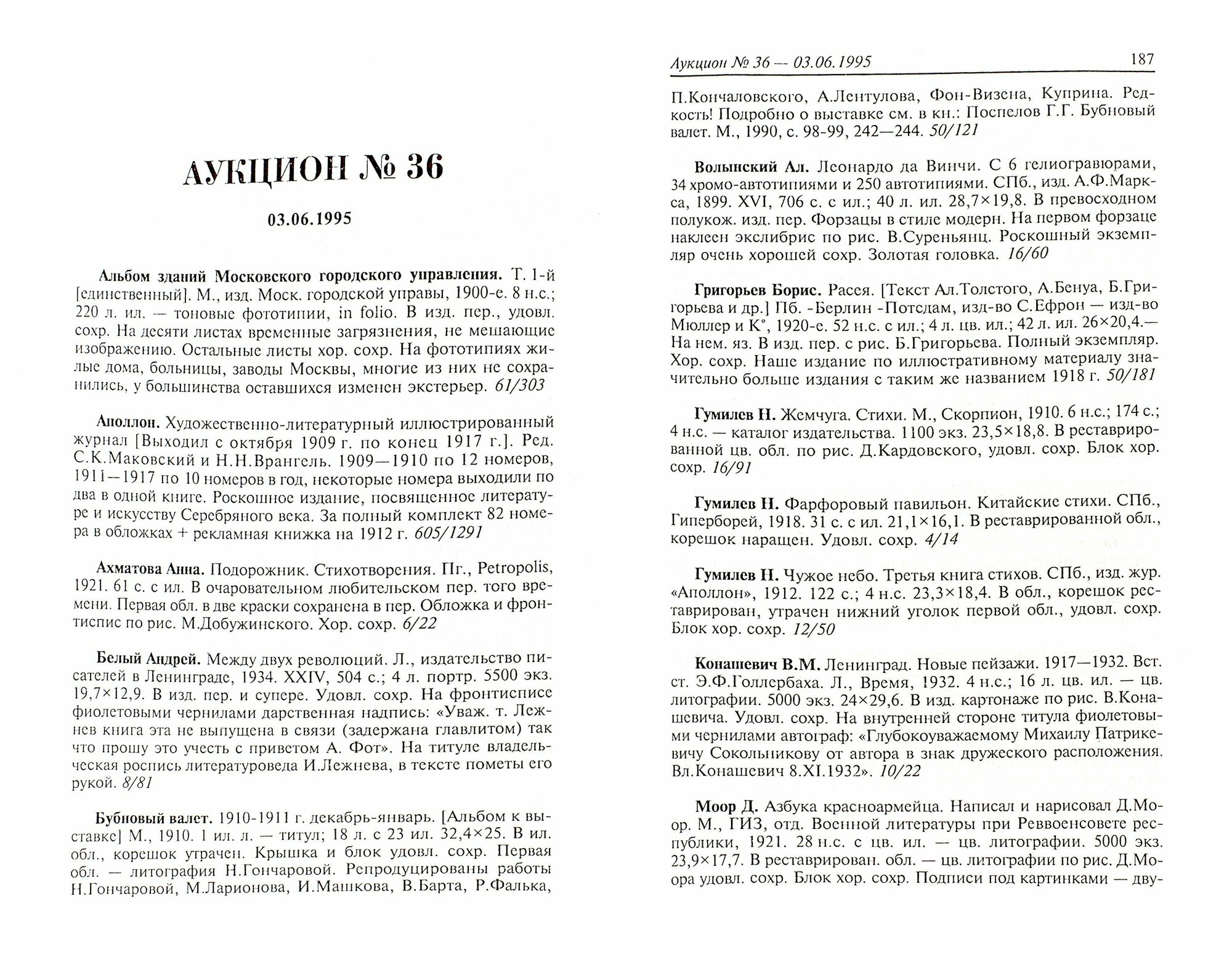 приводятся лишь избранные лоты первых 112 аукционов с описанием, в точности взятом из каталогов. По какому принципу осуществлен отбор избранных лотов, увы, не озвучено, и читатель этого никогда не узнает, не имея перед собой оригинальных каталогов. Что очень важно, проставлены стартовая и финальная цена лотов. Вот только, к сожалению, без расшифровки, поэтому необходимо разъяснить, что, по-видимому, имеется в виду изначальный аукционный шаг в 100 рублей: т.е. аббревиатура 14/152, к примеру, будет расшифровываться как "Стартовая цена 1400 руб., продано за 15 200 руб.".