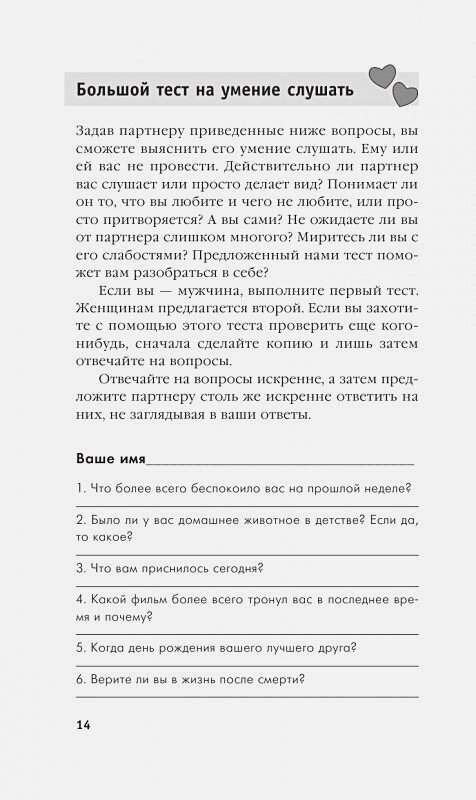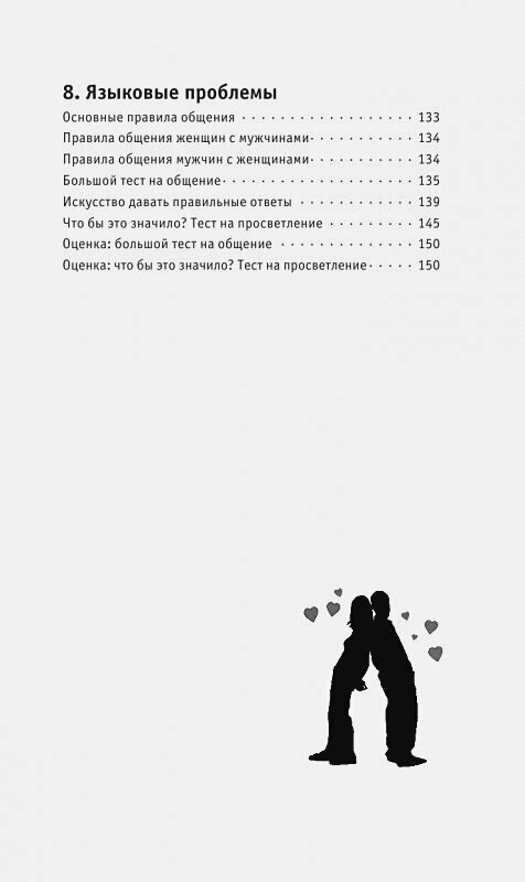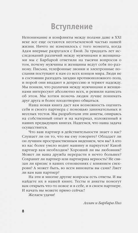 В этой книге всемирно известные эксперты по взаимоотношениям Аллан и Барбара Пиз, предлагают читателям пройти психологические тесты и порешать увлекательные головоломки. Все эти задания помогут вам оценить себя и своего партнера и узнать: подходите ли вы друг другу? Как наладить отношения, которые дали трещину? Возможно ли избежать ссоры? Что делать, если вы еще не нашли своего избранника? Прочитав эту книгу, вы обязательно встретите свою половинку и сможете построить гармоничные и счастливые отношения.