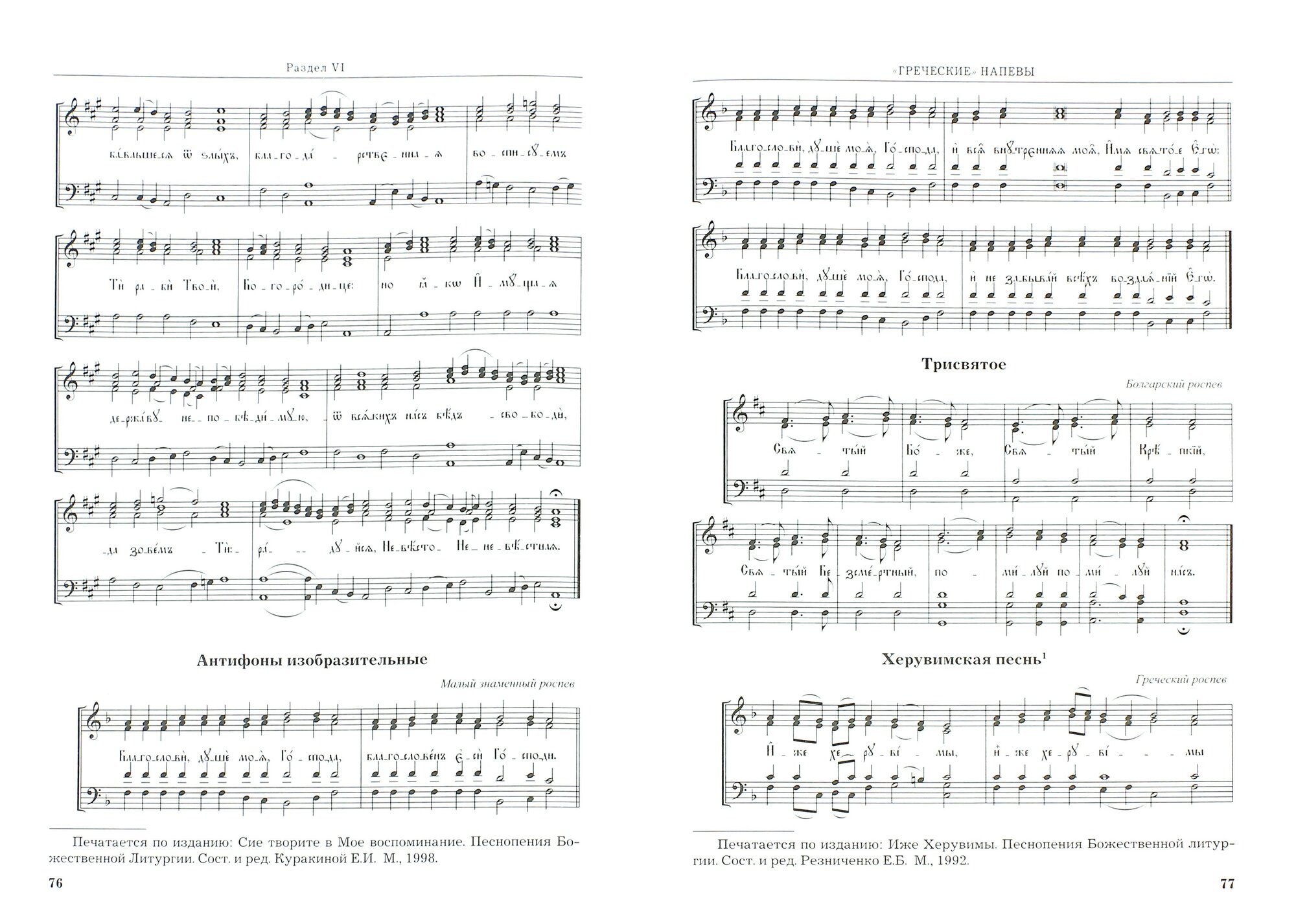 Перед нами хрестоматия к учебнику регентского мастерства. Материал разделен на 13 разделов, каждый из которых включает характерные образцы песнопений. Некоторые (наименее распространенные) приведены полностью, другие - отрывочно, в таком случае дается ссылка на источник.