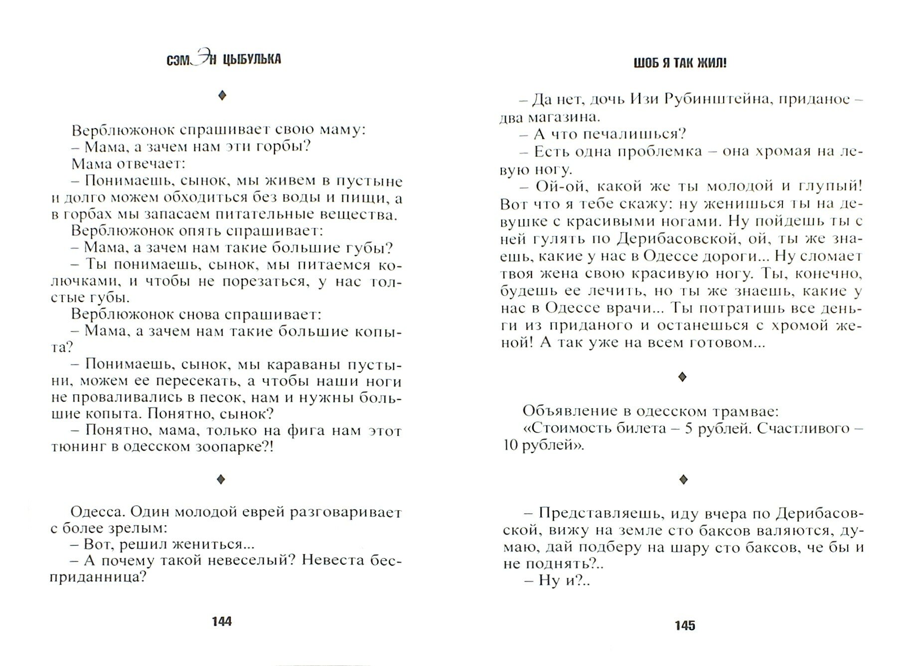 Книгу покупала для мужа пару лет назад, вместе со сборником "Таки еврЭйский анекдот". Выбирала наугад, исключительно по внешнему виду. Книга небольшого формата, но довольно-таки пухленькая, обложка симпатичная. Анекдоты смешные, но встречаются и на грани фола - а шо ви хотите, Одесса же! Периодически почитываем, книга не истрепалась, все листы на месте - переплет прочный. Для разнообразия таки брать!