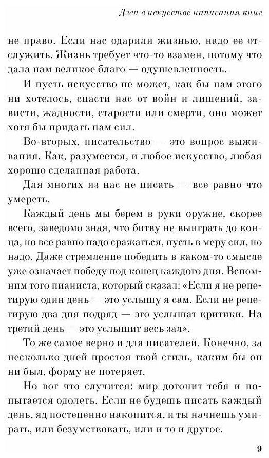 В этой книге собрано много больше, чем ожидаешь: реальные примеры (Вино из одуванчиков, Марсианские хроники и т.д.), подкреплённые историями их воплощения и мыслями Брэдбери, мотивация, а также дельные советы по удержанию музы. У каждого свой путь к писательству и, зачастую, он не простой. Брэдбери прошёл этот путь и решил стравить нас со своим пониманием этого искусства. Здёсь всё честно, а главное - это, разумеется, честность. Если Вы хотите найти в этой книге конкретные советы, то она не для Вас. Как и само писательство.