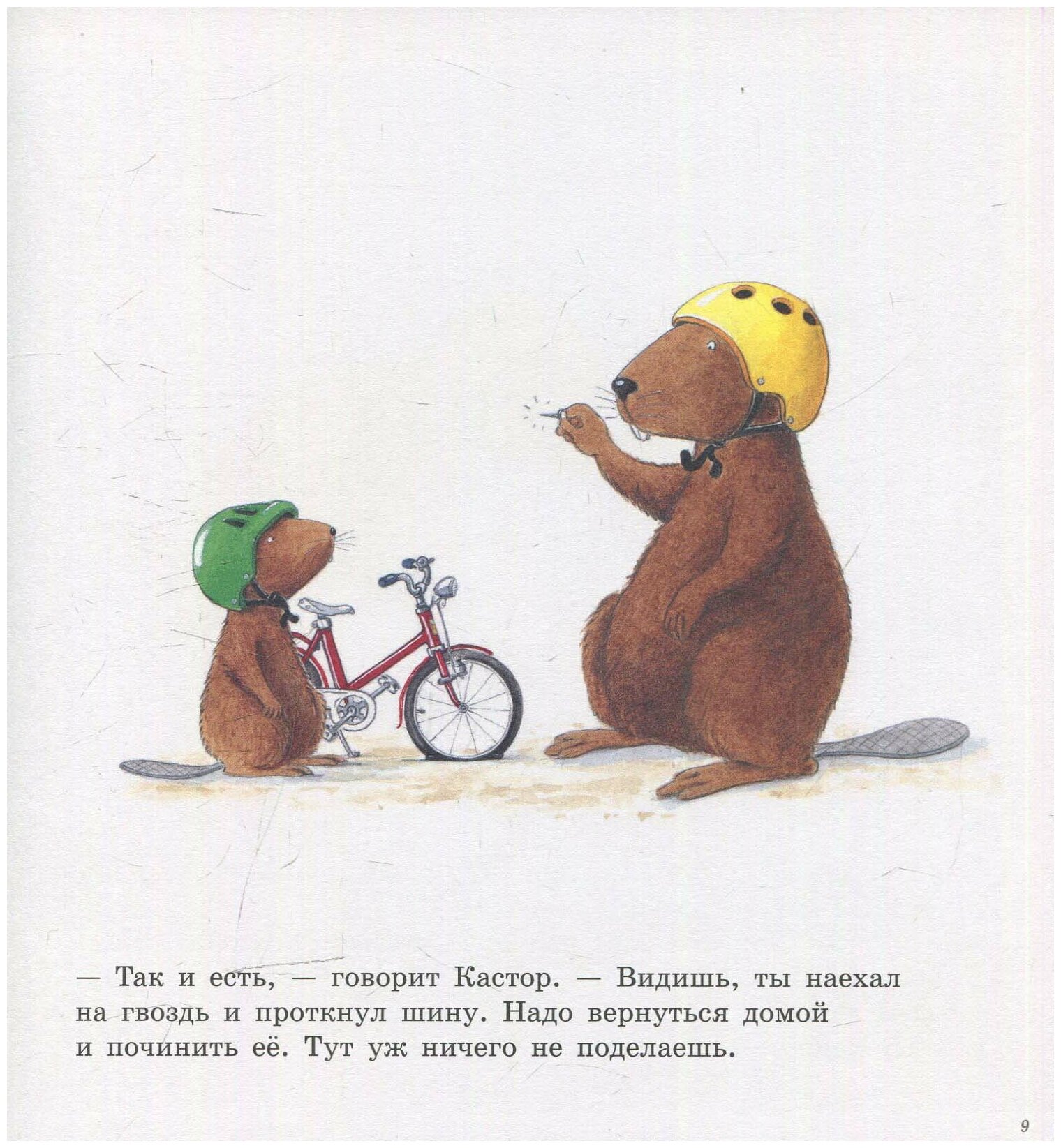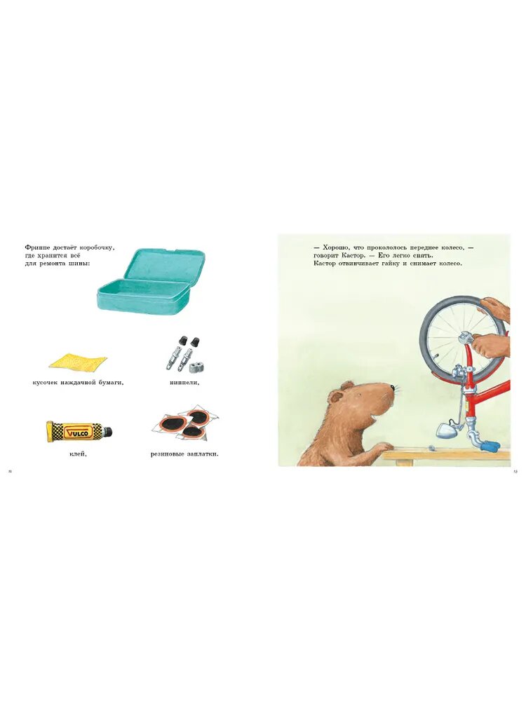 Познавательная книга-инструкция в картинках. Обаятельный бобер Кастор уже хорошо знаком многим читателям. Он умеет печь пироги, шить фартуки, выращивать фасоль, столярничать и красить, причем делает это так "заразительно", что непременно хочется всё повторить вслед за ним. Однажды бобёр Кастор вместе со своим другом бобрёнком Фриппе сели на велосипеды и отправились на пикник. Но увы, недалеко от дома Фриппе наехал на гвоздь и проколол шину. Что делать? Конечно же, чинить! Кастор показывает Фриппе, как правильно снять колесо, найти прокол и поставить заплатку. Объясняет, что велосипедная шина состоит из покрышки и камеры, показывает, как пользоваться монтажками и как не растерять мелкие детали в процессе ремонта. Оказывается, чинить шину так увлекательно! И совсем не сложно.