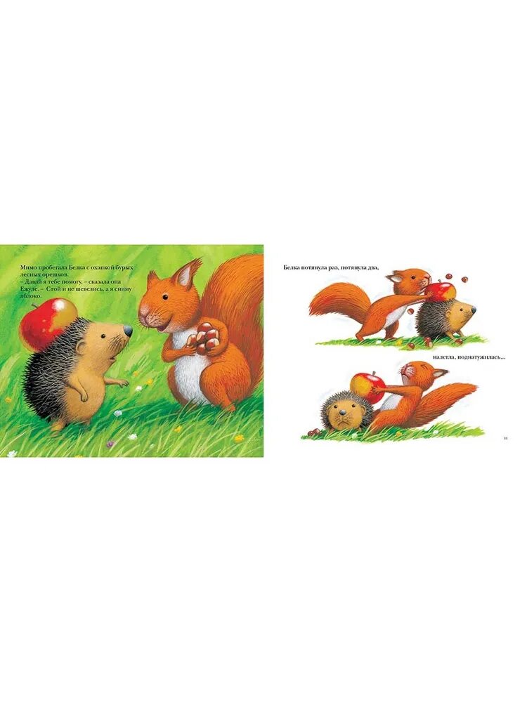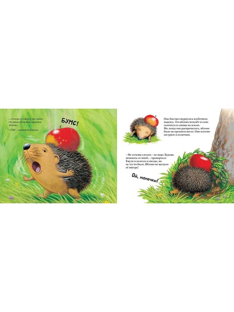 Однажды осенью ежиха по имени Ежуля закончила обустраивать себе уютное гнёздышко для зимней спячки и уже собралась забраться в него, как вдруг откуда-то сверху ей на спину упало большое красное яблоко. Яблоко было тяжёлыми и плотно засело в колючках, но это еще полбеды. Самое страшное, что с огромным яблоком на спине Ежуля больше не могла пролезть в собственное гнездо! И если бы не счастливый случай, пришлось бы бедняжке зимовать на улице.