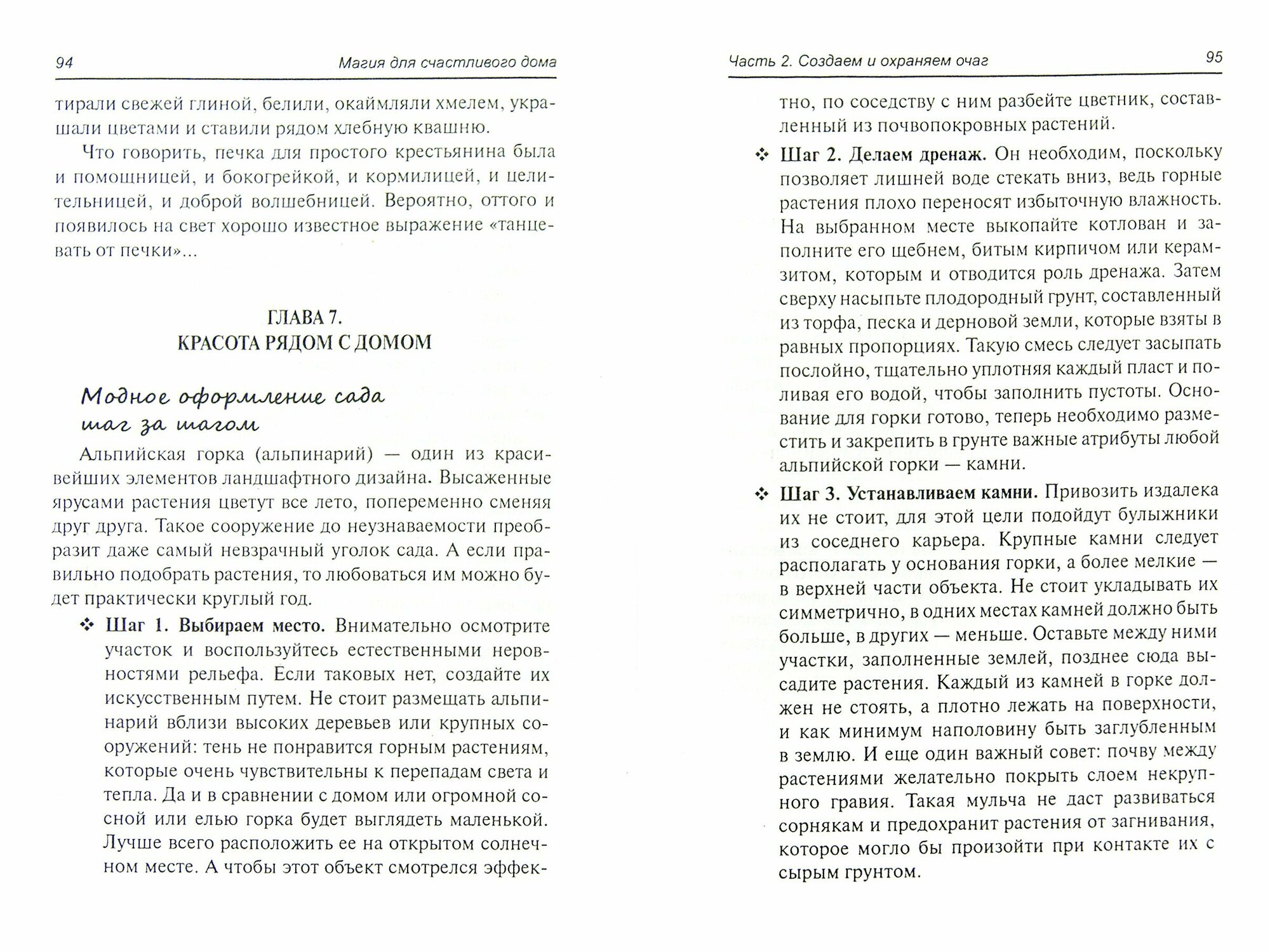 Поражает количество информации - "воды" нет, все четко по делу (практически как инструкция) и при этом достаточно подробно. Много незнакомой информации. Поражаешься, из скольких мелочей состоит "счастливый дом ". Затронуты все темы последовательно: как привлечь любовь и не ошибиться в выборе половинки, свадьба, создание семьи
