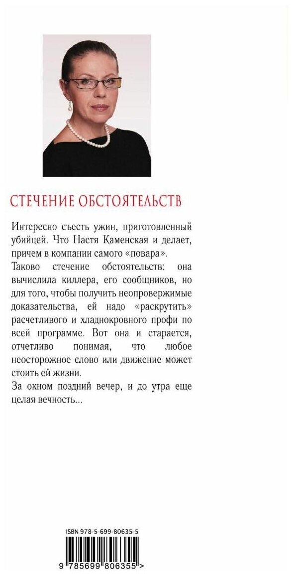 Интересно съесть ужин, приготовленный убийцей. Что Настя Каменская и делает, причем в компании самого "повара". Таково стечение обстоятельств: она вычислила киллера, его сообщников, но для того, чтобы получить неопровержимые доказательства, ей надо "раскрутить" расчетливого и хладнокровного профи по всей программе. Вот она и старается, отчетливо понимая, что любое неосторожное слово или движение может стоить ей жизни. За окном поздний вечер, и до утра еще целая вечность...