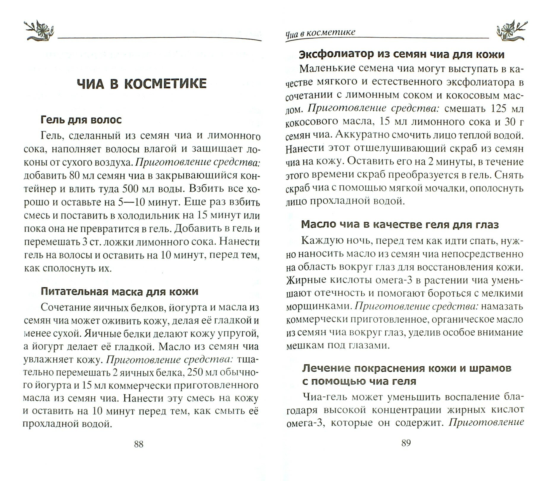 Семена чиа состоят из значительного количества клетчатки, антиоксидантов и витаминов группы В, жизненно важных минералов и микроэлементов… Удивительным свойством семян является высокое содержание жирных кислот, которые важны для сердца и понижают уровень холестерина, также они помогают уменьшить боли при артрите. Они способствуют ускорению сжигания и поглощения жира и, имея низкий гликемический индекс, на длительное время снижают аппетит. Прием зерен чиа помогает стабилизировать давление и нарушенную работу нервной системы, при этом значительно улучшается память…