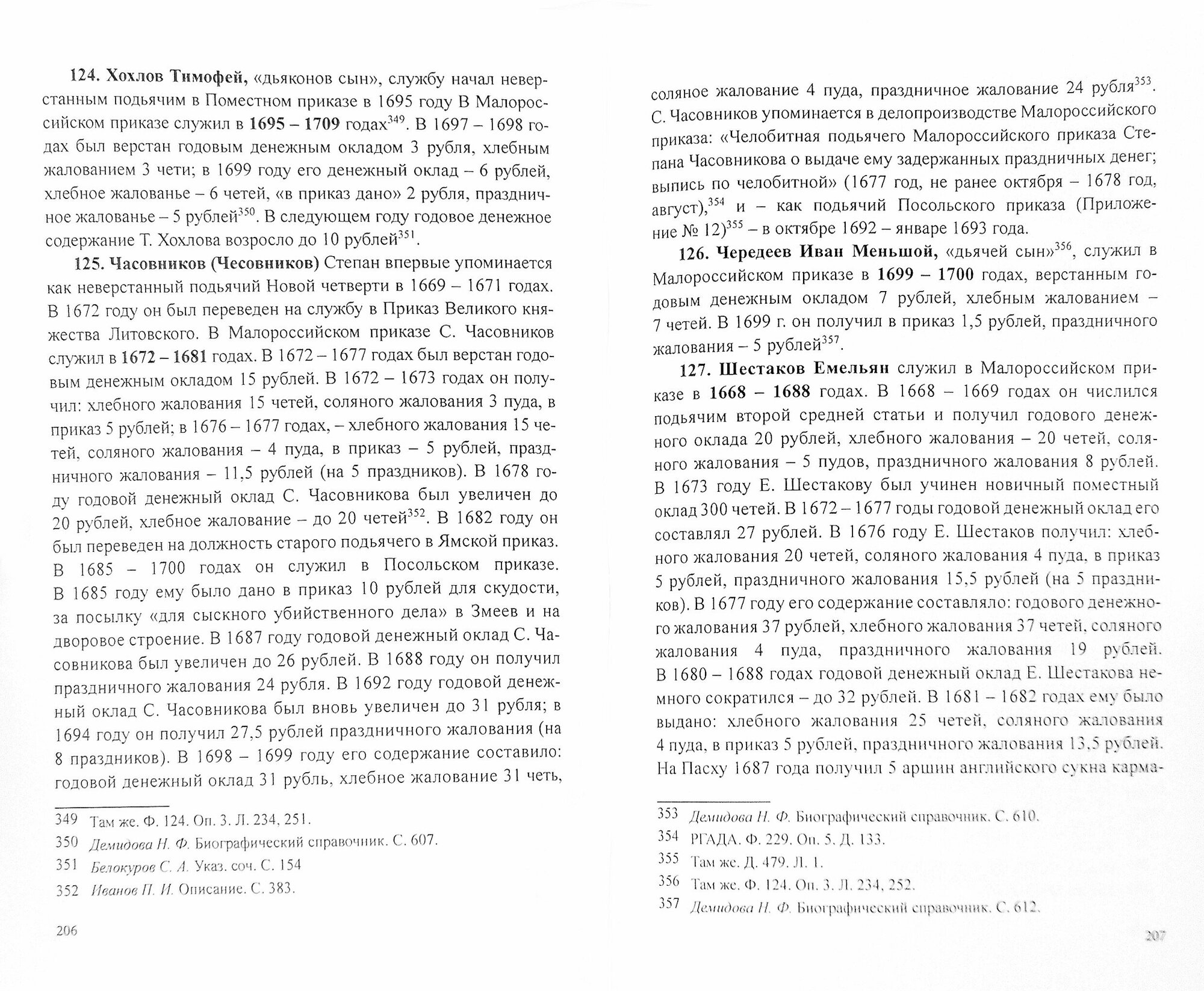 Одно из новейших исследований по истории Малороссийского приказа. Основанное на документах из 124 и 229 фондов РГАДА. Приложены биографические сведения о служащих приказа за весь период существования, разобраны его структура и основные направления деятельности. Некоторым недостатком авторской позиции можно считать атрибуцию того или иного приказного служащего за весь период его упоминания в источниках как сотрудника ведомства. Рекомендуется для специалистов.