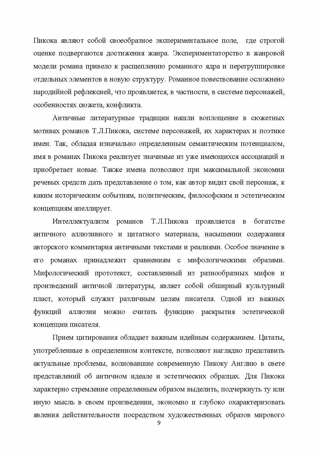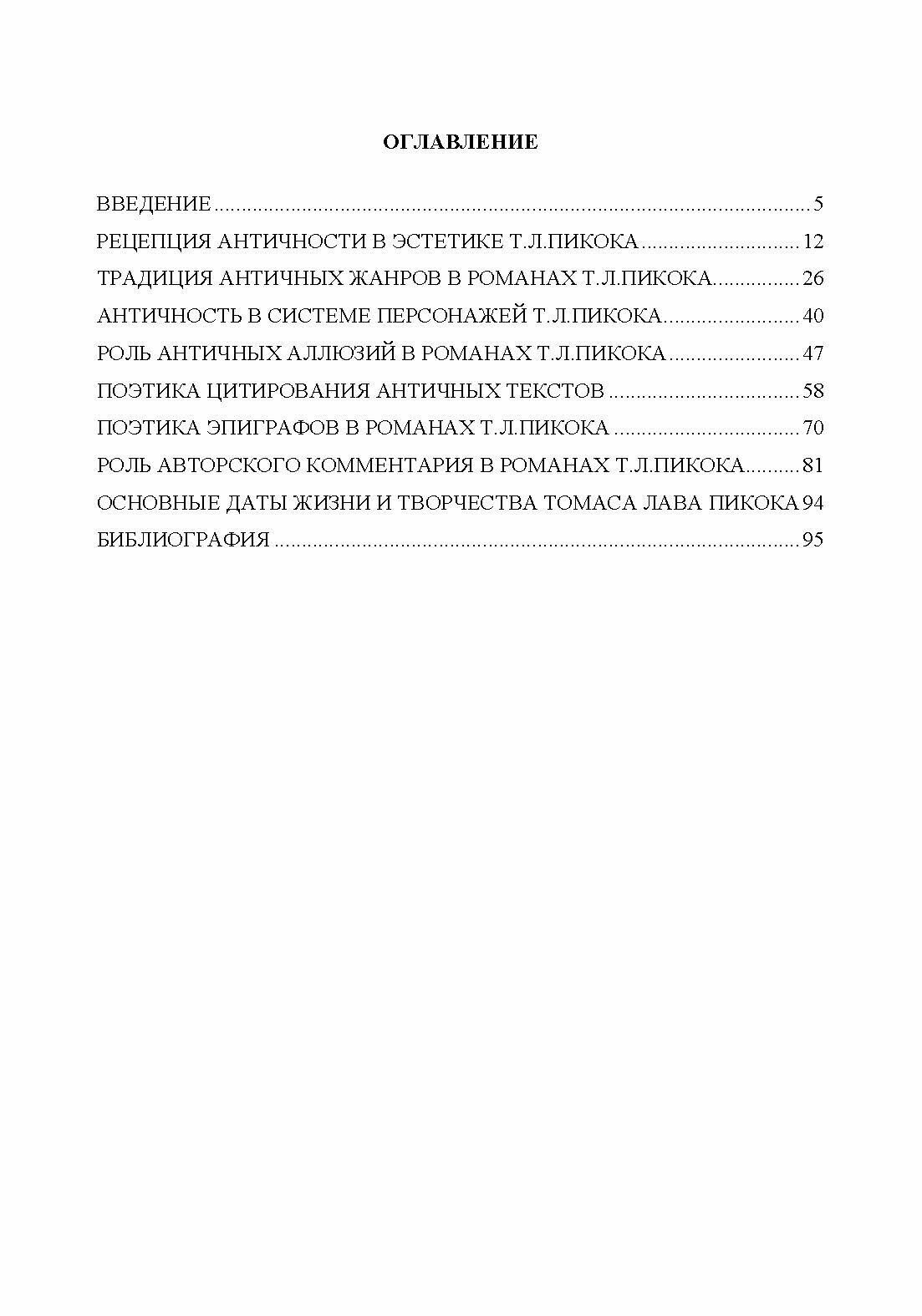 Особое внимание в работе уделено таким аспектам художественного освоения античности в творчестве Т.Л.Пикока, как традиция античных жанров, античность в системе персонажей, роль античных аллюзий, поэтика цитирования античных текстов, поэтика эпиграфов, роль авторского комментария в романах писателя.