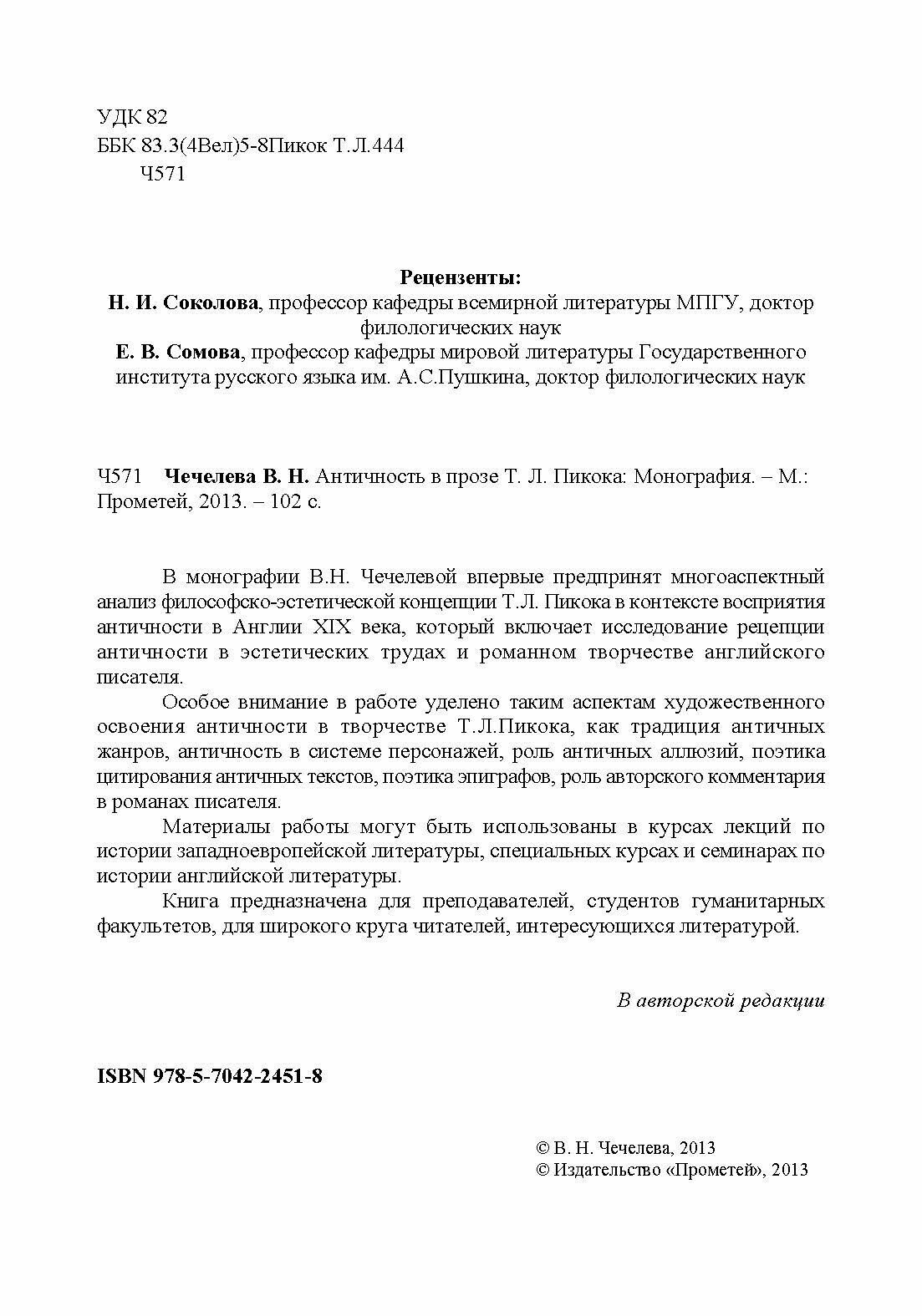 В монографии В.Н. Чечелевой впервые предпринят многоаспектный анализ философско-эстетической концепции Т.Л. Пикока в контексте восприятия античности в Англии XIX века, который включает исследование рецепции античности в эстетических трудах и романном творчестве английского писателя.