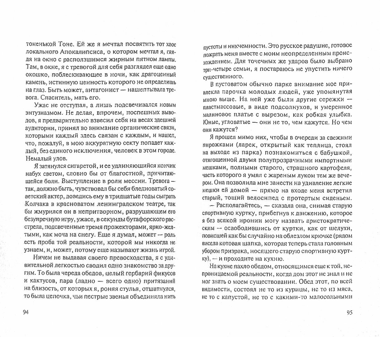 "Эта книга - результат процесса, то есть - побочный эффект моей побочной деятельности, писательства, которому я уделяю времени не так много, как еде, питью, работе, сну. Так я думаю, вернее, не думаю о ней, разделенной для меня навсегда на такое количество частей, какое может быть числом только простым и все равно непонятным - задним числом, иначе говоря, чем-то неустойчивым, но устоявшимся. Глядя на эту устойчивость, я лично не могу надивиться чуду остановленной речи: как это славно и страшно, что речь кончается, так и не дойдя до причин, по которым началась. На то и необъятен мир, чтобы не было встреч помимо той, громадной, которая существует и которая всегда".