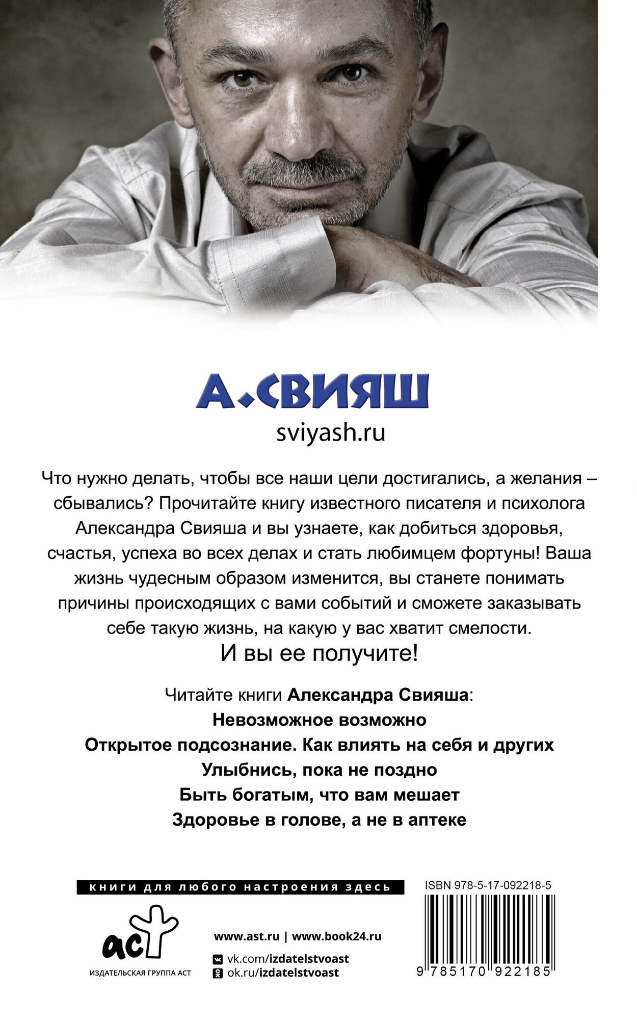 Прочитайте книгу известного писателя и психолога Александра Свияша и вы узнаете, как добиться здоровья, счастья, успеха во всех делах и стать любимцем фортуны! Ваша жизнь чудесным образом изменится, вы станете понимать причины происходящих с вами событий и сможете заказывать себе такую жизнь, на какую у вас хватит смелости. И вы ее получите!