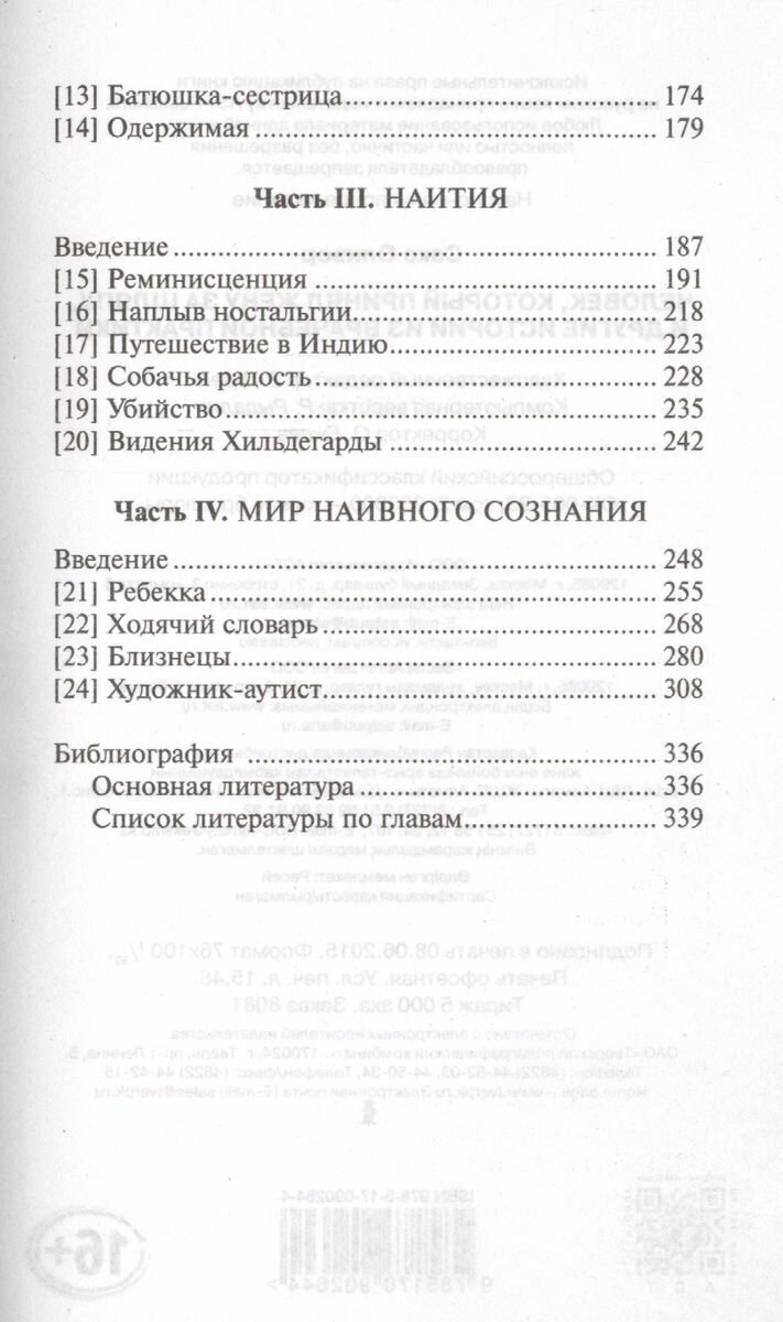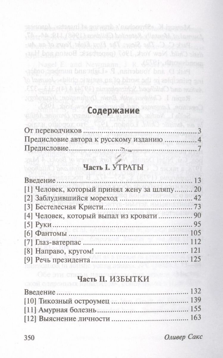 В числе пациентов знаменитого нейропсихолога вы встретите человека, который каждую ночь выбрасывает свою ногу из кровати (и выпадает следом за ней), поскольку это «чья-то отрезанная, мертвая нога», и старушку, в голове которой беспрестанно звучит концерт ирландской музыки, и близнецов, рассчитывающих в уме простые числа шестого или седьмого порядка, и многих других. И как с ними будут обходиться окружающие, как их будут лечить и воспринимать, повлияет на их дальнейшую судьбу, ведь неправильное лечение и попытка некорректной «социальной адаптации» может нанести существенный вред и уничтожить остатки личности.