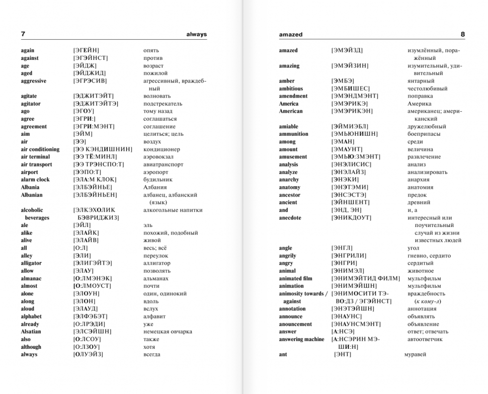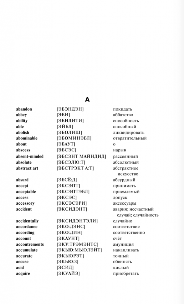 В каждой части содержится по 4000 самых употребительных слов. Все слова снабжены транскрипцией русскими буквами, причем в русско-английской части тоже дается транскрипция английских слов.