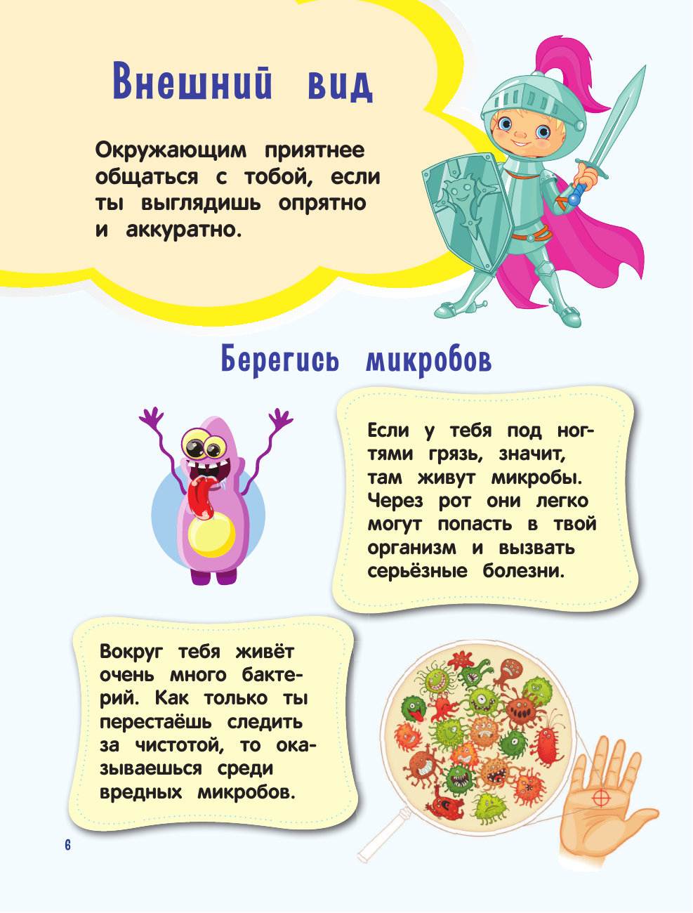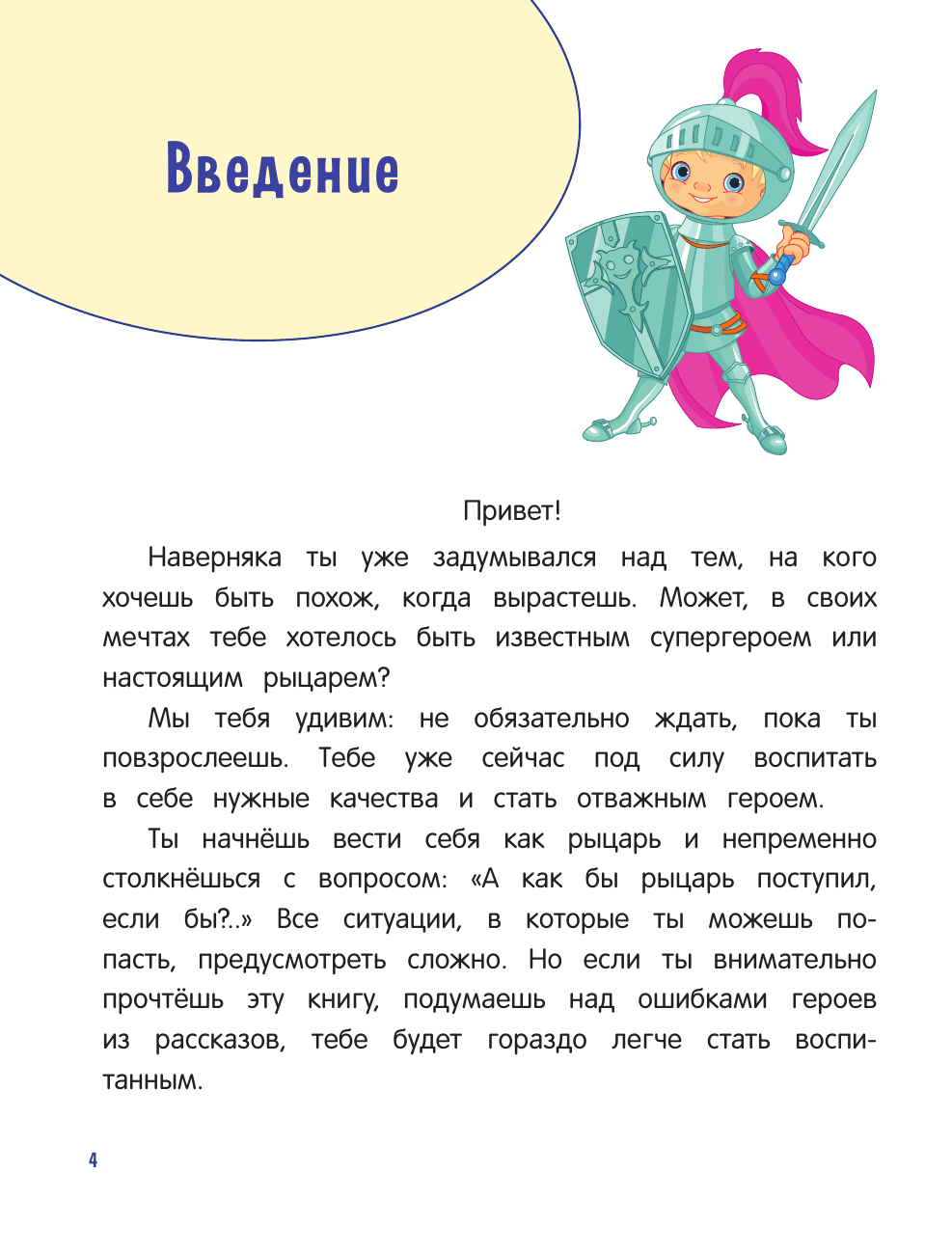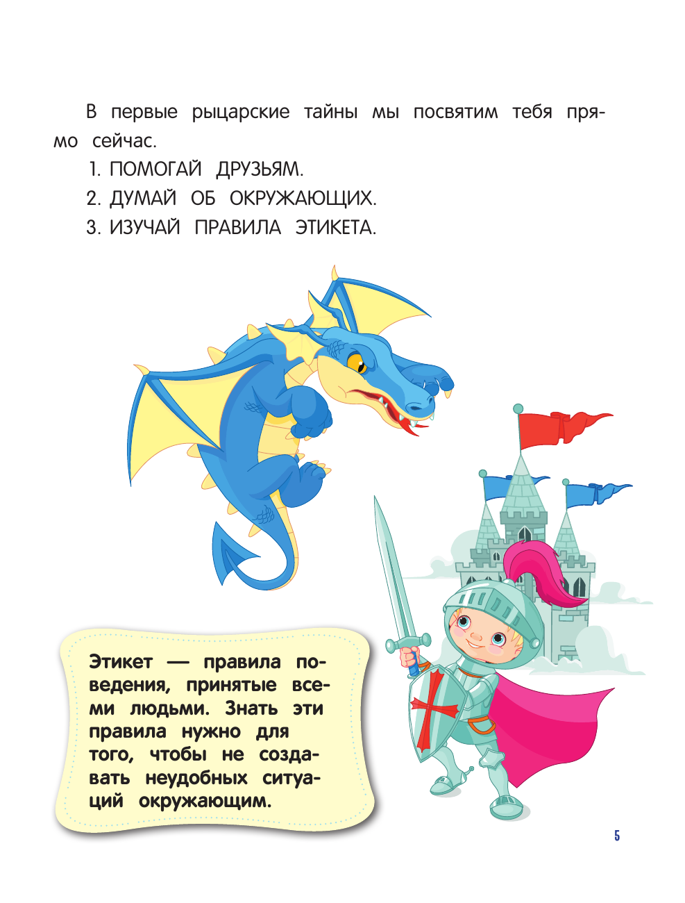 Книжка небольшая по объему, но в ней удалось вместить много важной и полезной, а главное, хорошо преподнесенной информации о том, как себя следует вести в самых разных ситуациях. Здесь мы нашли и кодекс чести для друзей, и вежливые слова для рыцарей, и научные обоснования пользы чтения простыми словами, и многое другое. Небольшие истории позволяют ребенку примерить ситуацию на себя. На каждой страничке есть интересная справочная информация о понятиях и терминах. Текст читается легко. Можно было бы разбавить его юмором. Но это уже мои капризы! Все поправимо в процессе чтения)))