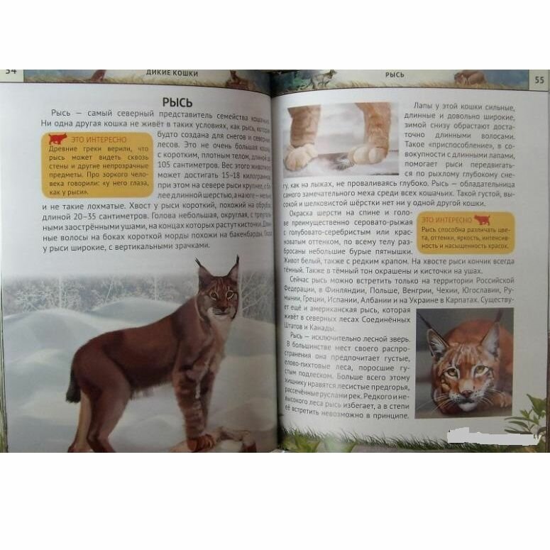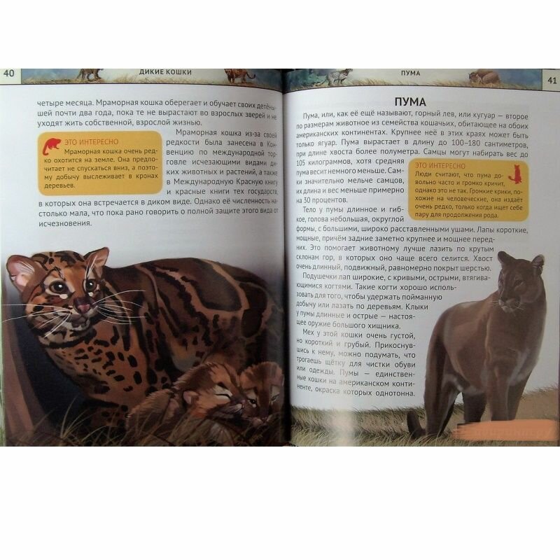 Любим мы кошечек! И домашних любим и диких, выбираем по ярким, красочным, насыщенным иллюстрациям или фотографиям. Дочь увидела эти печальные глаза на обложке и покупка была неминуема :)) К содержанию вопросов нет: кратко и занимательно. Картинки откровенно компьютерные.