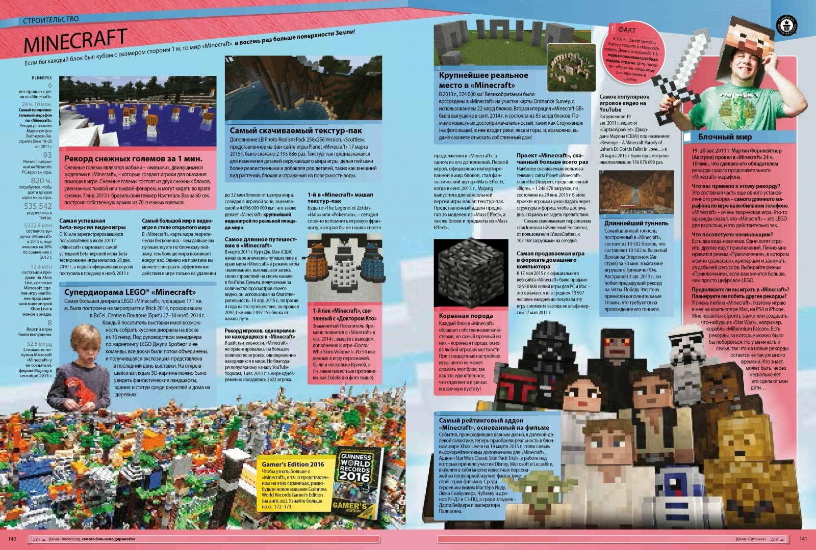 - тысячи новых рекордов в самых актуальных областях. В их числе: самое прибыльное игровое приложение для iOS (Clash of Clans - более 1 млн фунтов (более 1,5 млн долл. в день) и официальный трейлер кинофильма, собравший наибольшее число просмотров ("Мстители: Эра Альтрона" - более 75 млн просмотров на YouTube). Две страницы посвящены конструкторам LEGO, четыре - футболу!