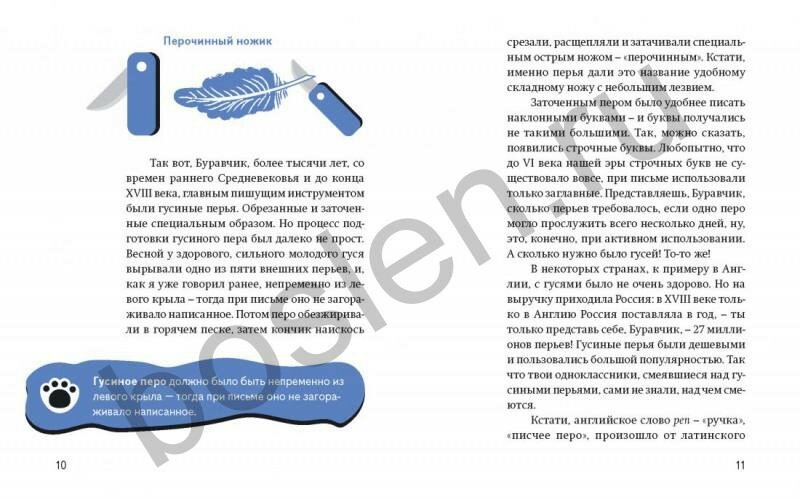 А еще в книге несколько практических заданий, написанных очень доступно и проиллюстрированных. Например, вместе с Буравчиком можно самостоятельно сделать перо для письма, восковую дощечку, какой пользовались древние люди вместо бумаги, украсить ручку для подарка, изготовить карандаш и даже «приготовить» бумагу.