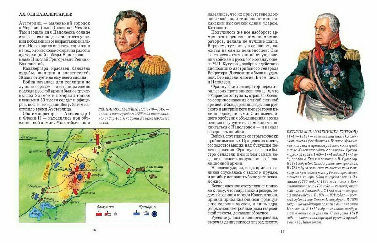 Очень интересный том из замечательной серии «История России». Книга рассчитана на школьный возраст, но будет интересна и взрослым. Читается очень легко, интересный рассказ дополнен многочисленными иллюстрациями. Есть портреты и описание жизнедеятельности многих русских и французских полководцев и офицеров. Понравились развороты, на которых представлены образцы оружия русской и французской армий, а также военные обеих армий.