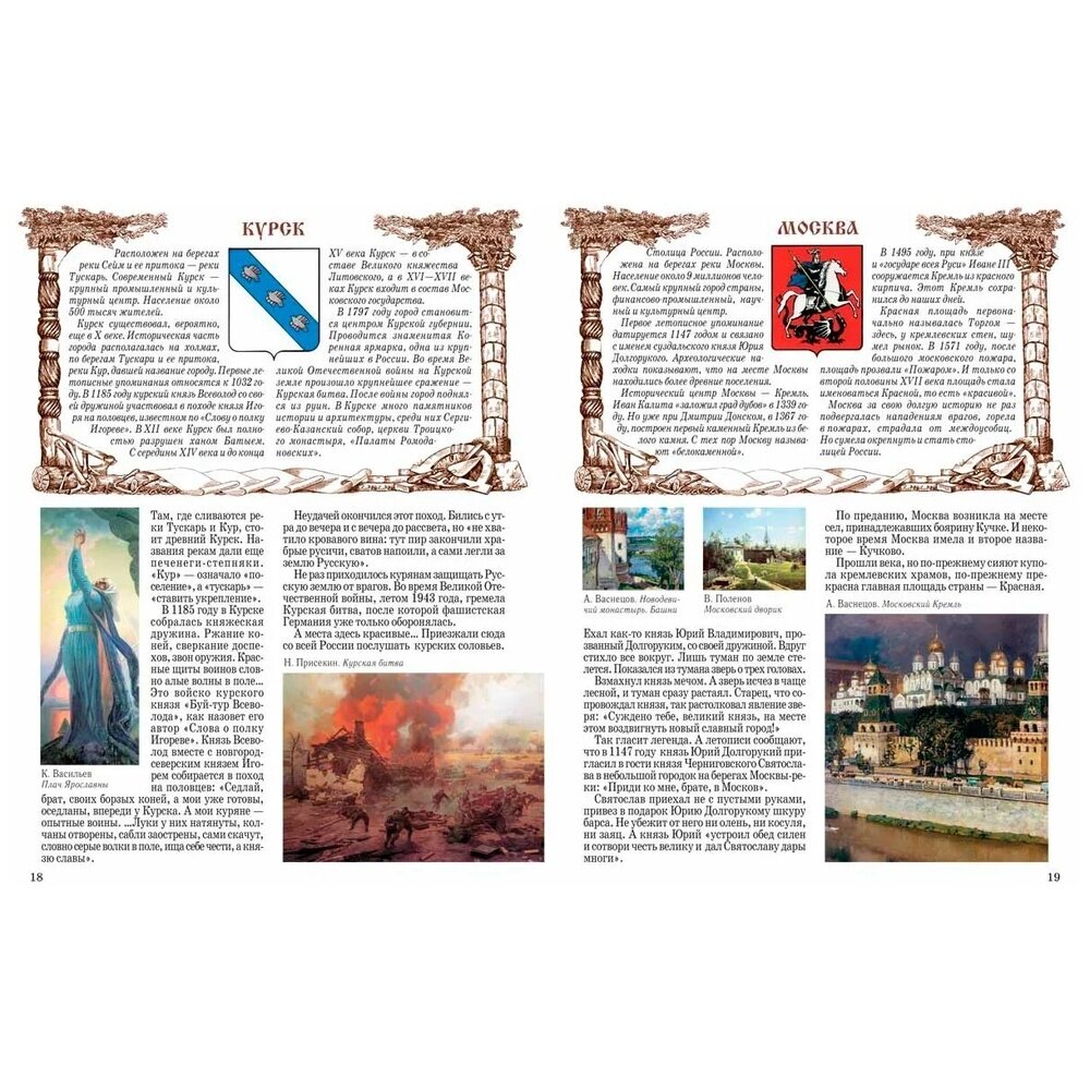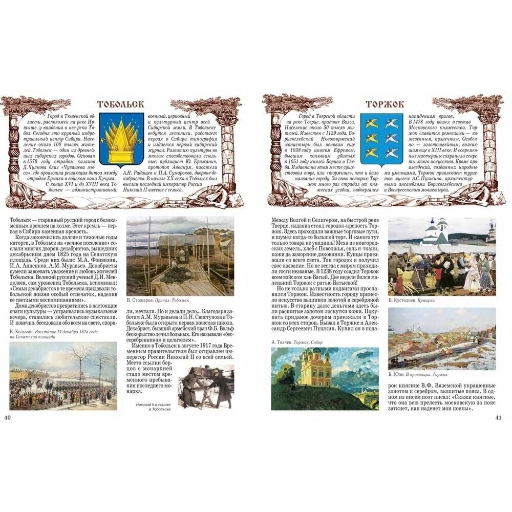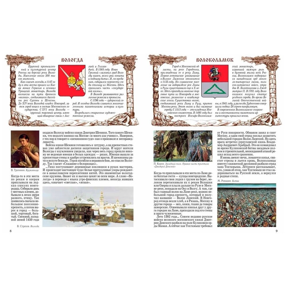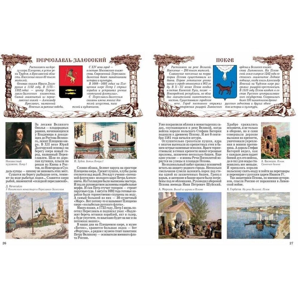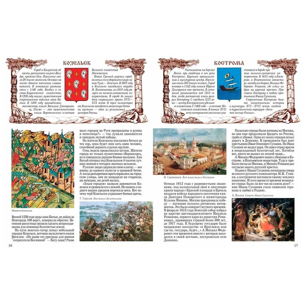 В книге рассказывается про 46 российских городов. Каждому городу посвящена одна страница. Дается герб, основные сведения и довольно-таки интересный рассказ про историю основания города. Язык живой, читать интересно. Еще что понравилось - множество иллюстраций с картинами, которые имеют какое-либо отношение к данным городам.