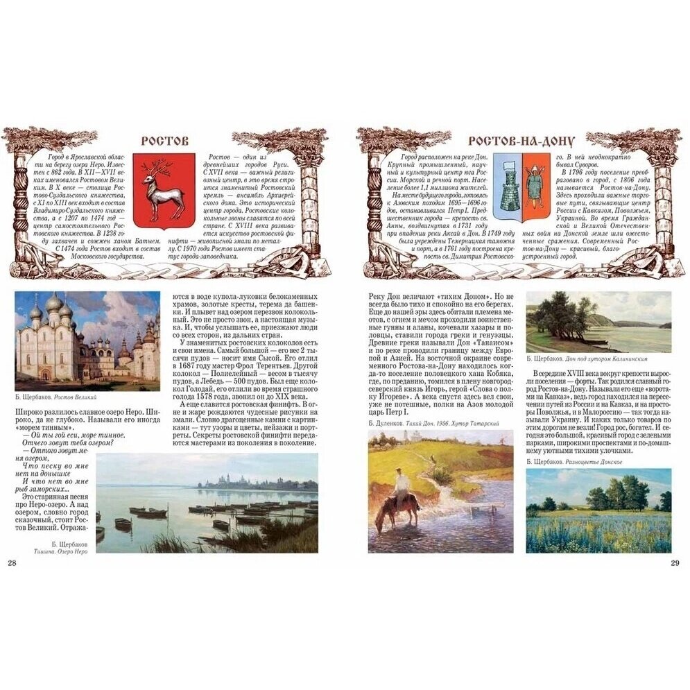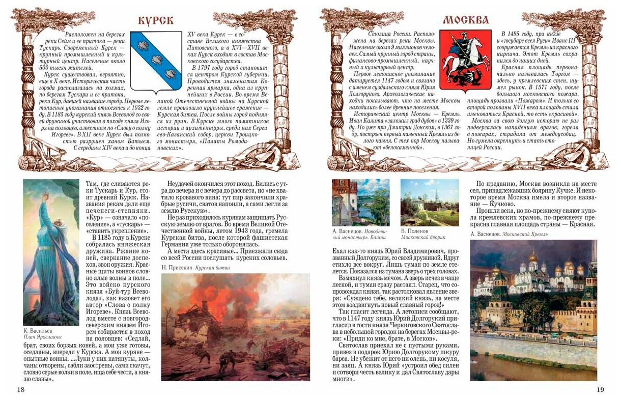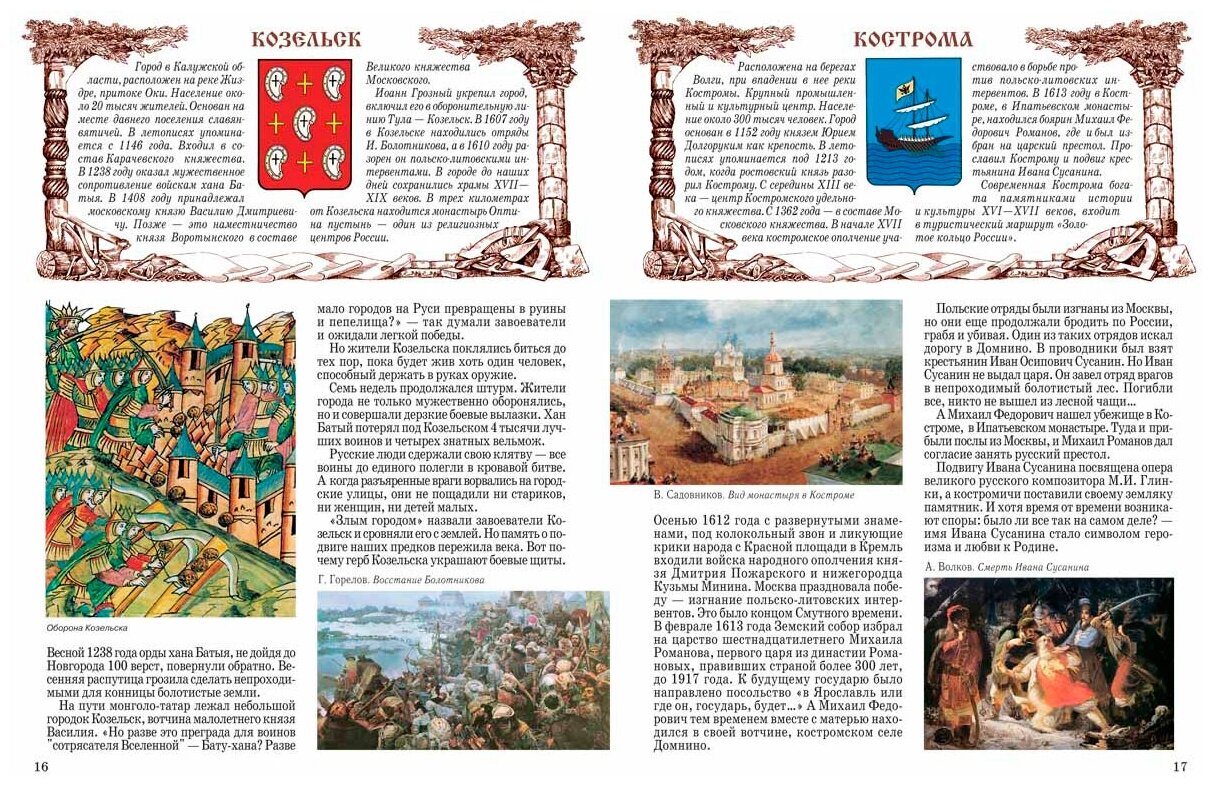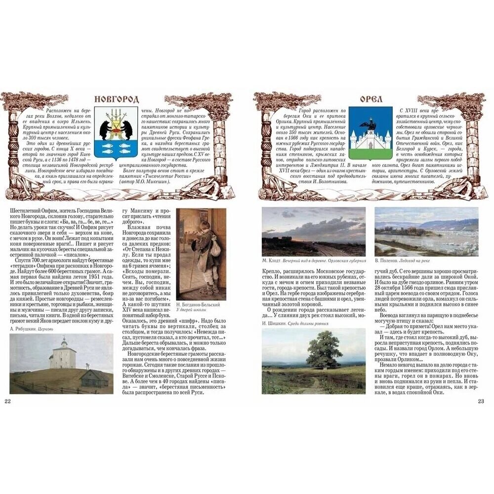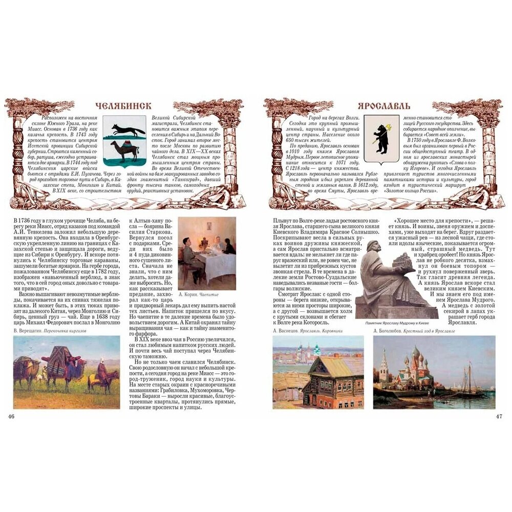В книге рассказывается про 46 российских городов. Каждому городу посвящена одна страница. Дается герб, основные сведения и довольно-таки интересный рассказ про историю основания города. Язык живой, читать интересно. Еще что понравилось - множество иллюстраций с картинами, которые имеют какое-либо отношение к данным городам.
