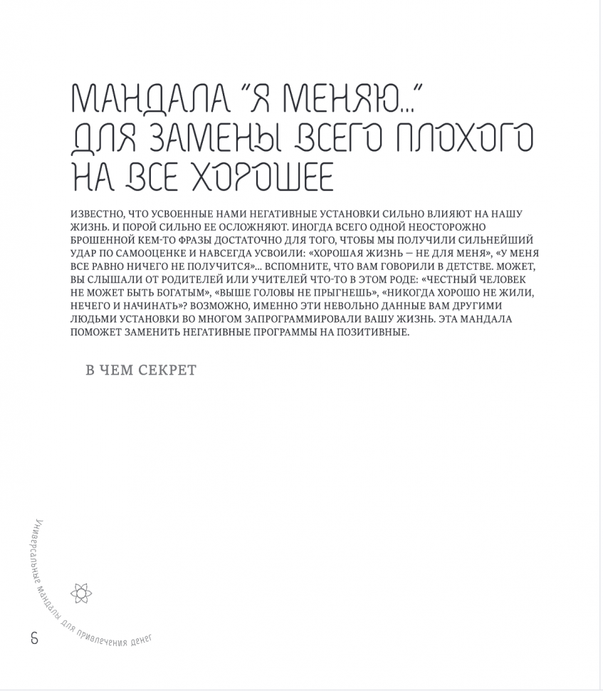 Мандалы и янтры, собранные в этом альбоме, служат для привлечения в нашу жизнь денег и увеличения благосостояния. Им под силу разрушить неправильные психологические установки относительно денег, которые многие из нас усвоили еще в детстве. «Честным путем много не заработаешь», «Не в деньгах счастье» или «Все в жизни достается тяжким трудом» — пришла пора нарисовать свои денежные мандалы и одновременно стереть из памяти все эти пессимистичные программы. Под руководством опытного специалиста по позитивной психологии Лилии Габо вы можете начать работу с мандалами прямо сейчас. Каждый из узоров сперва привлекает ваш взгляд как бы внутрь "круга вселенной", затем взгляд перемещается к центр, на его поверхность и начинается процесс трансформации реальности...