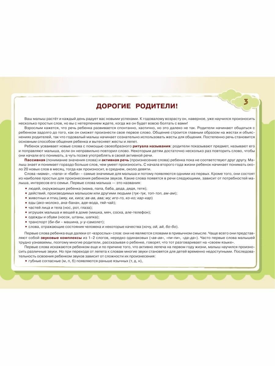 Рассматривая яркие рисунки, выполняя простые задания, собранные в этой книге, малыш быстро начнёт говорить свои первые слова - названия членов своей семьи, животных, предметов окружающего мира. Научится понимать речь взрослых, пополнит свой словарный запас.