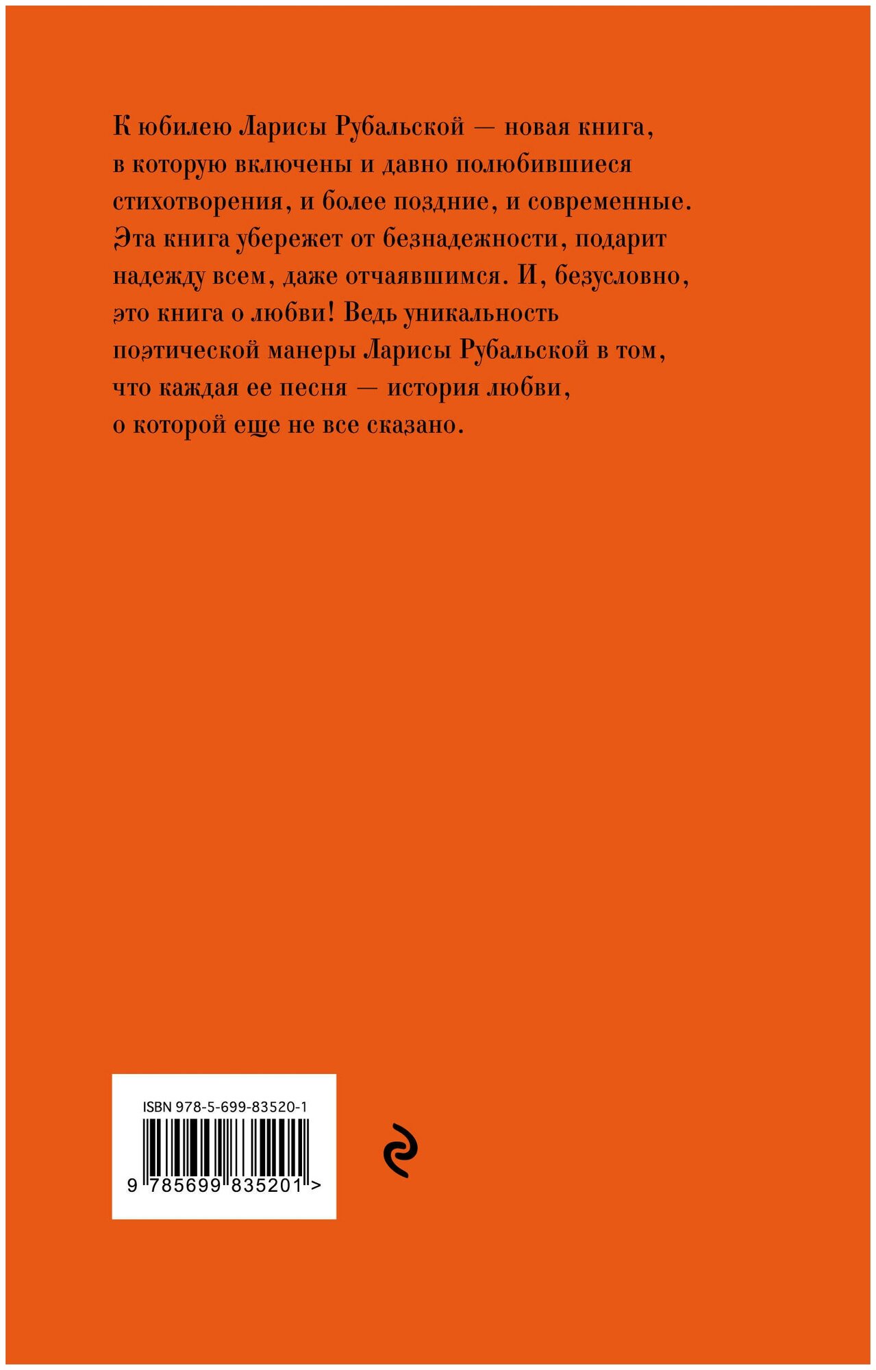 К юбилею Ларисы Рубальской новая книга, в которую включены и давно полюбившиеся стихотворения и более поздние и современные стихотворения. Эта книга убережет от безнадежности, подарит надежду всем, даже отчаявшимся. И безусловно это книга о любви! Ведь уникальность поэтической манеры Ларисы Рубальской в том, что каждая ее песня - история любви, о которой еще не все сказано.