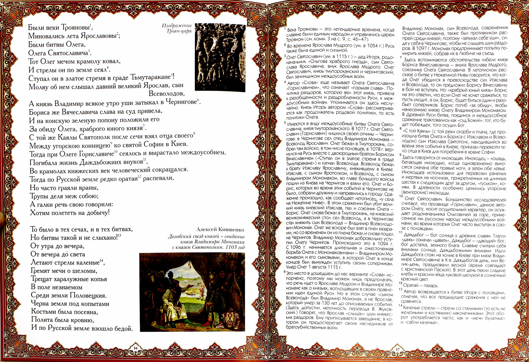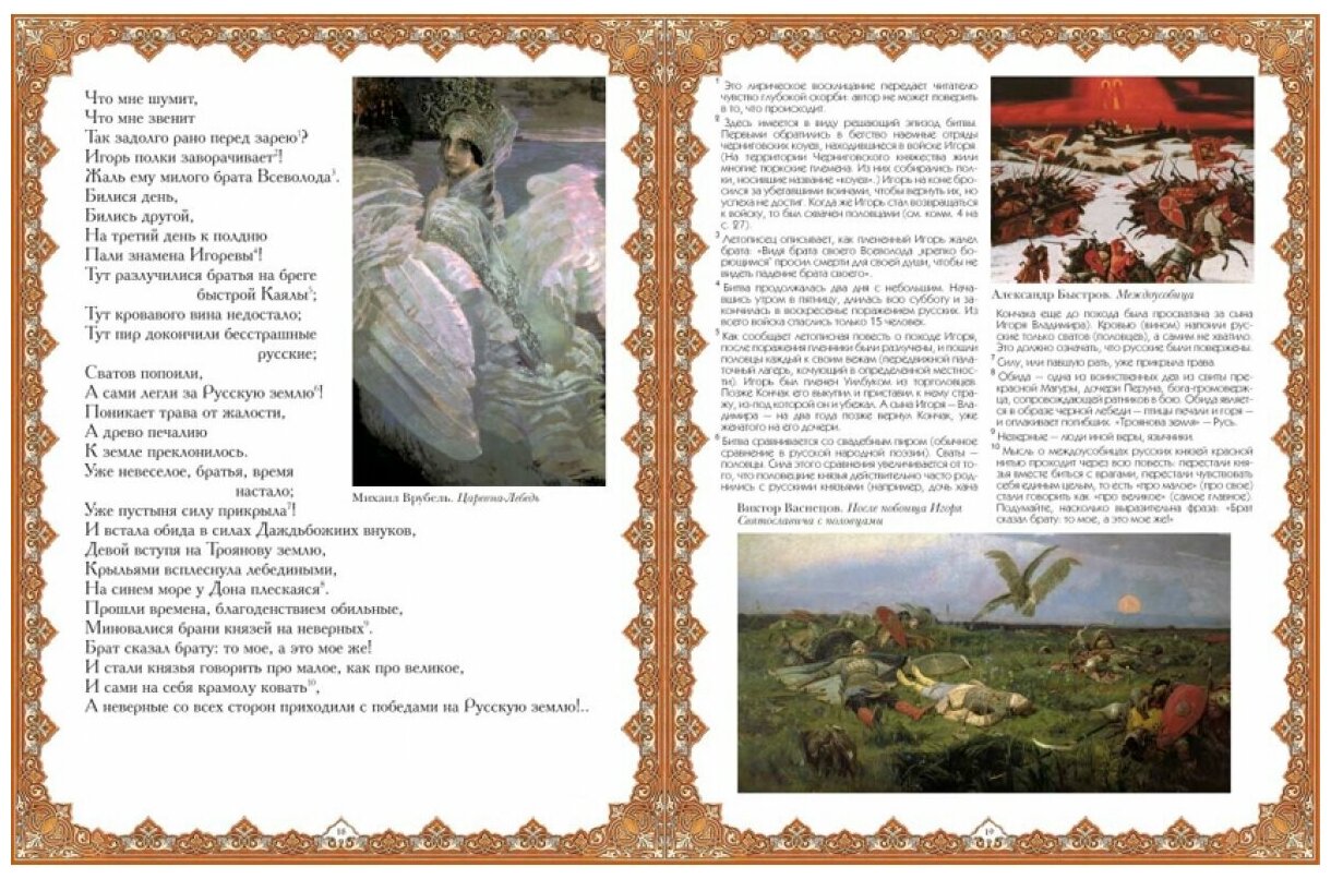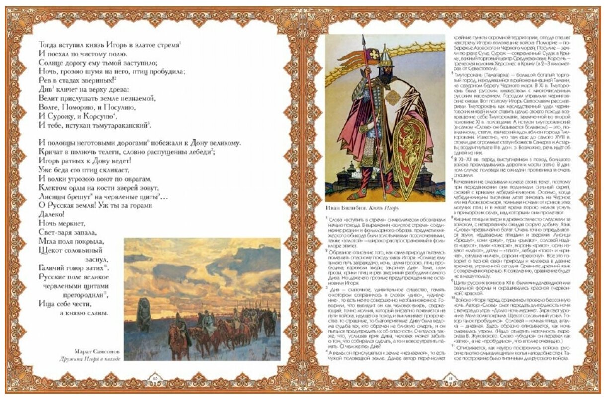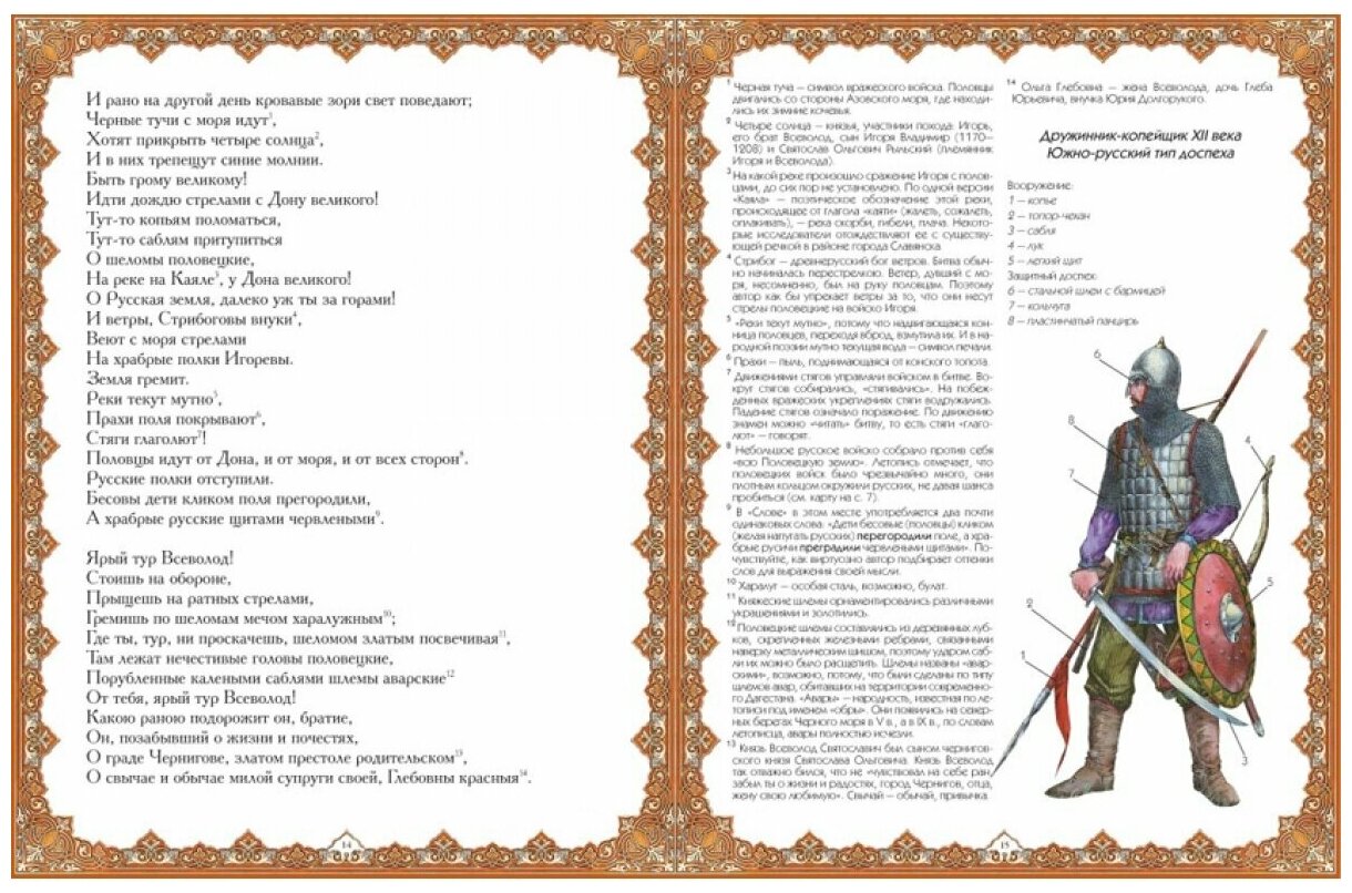 Покупала книгу для своей дочери - школьницы. Характер издания - чисто просветительский, во вступительной статье - только история находки древней рукописи, а жаль. Несколько слов о "Слове" как источнике исторических, литературных или культурологических открытий (любой из этих ракурсов)были бы очень уместны, ведь обращение к такому памятнику всегда повод для размышлений. К тому же, я ожидала увидеть хотя бы фрагмент первоисточника, т.е текста на старославянском, а уж потом - в переводе Жуковского, как это делалось в советских ещё изданиях. Помню, что мы, будучи школьниками, прежде всего с интересом читали и разбирали старославянский текст, слушали, как он звучит и сравнивали с переводом Жуковского. Иллюстрации конечно в издании красочные, но придётся доставать советскую брошюру, которая содержит оба варианта "Слова". Двоякое впечатление осталось от книги, прежде всего - от её идеи.