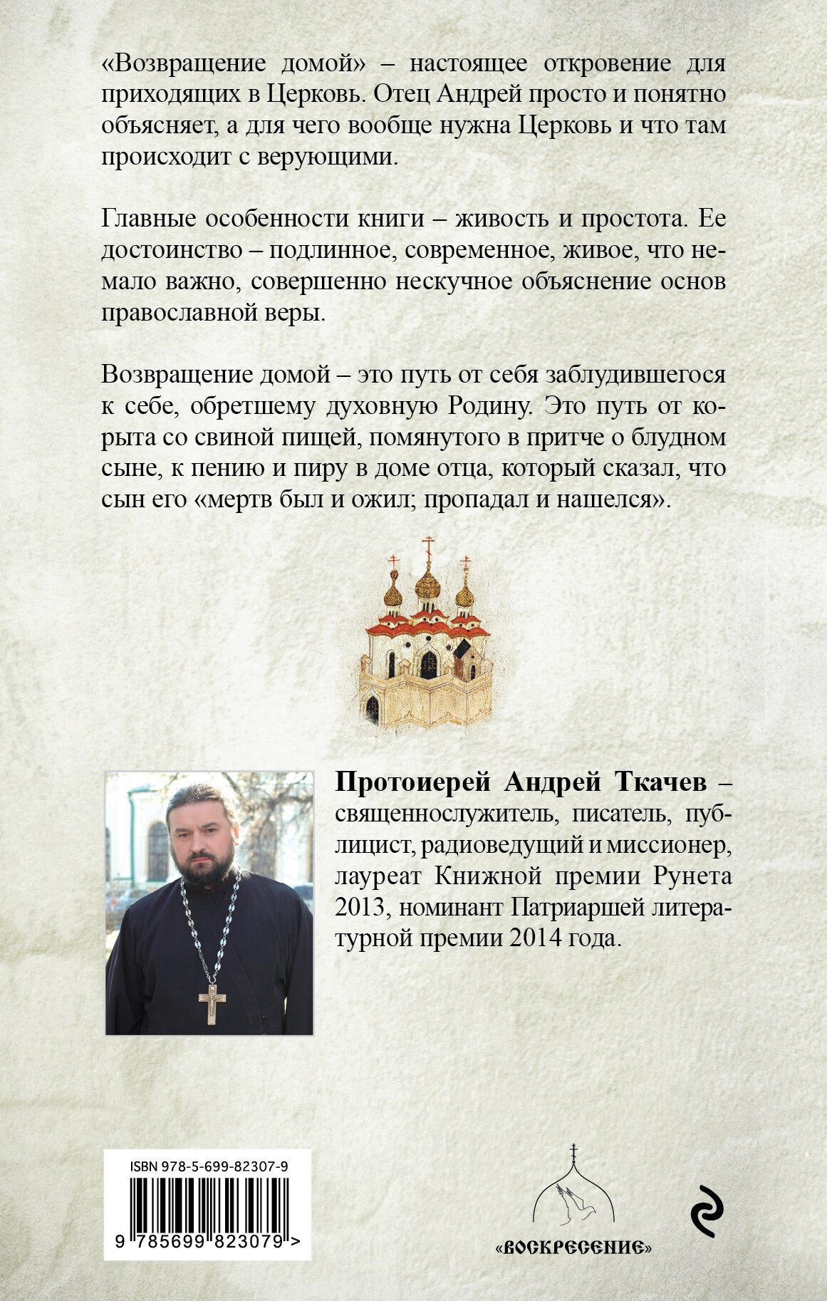Возвращение домой Когда рождается вера. Андрей Ткачев. В церковь хожу редко, нет ни сил, ни времени, да и как то пока не дошла еще, морально, хотя мне кажется. что я верю в Бога. Именно чтобы разобраться в себе , и купила книгу- Автор ее, протоиерей пишет именно для тех, кто только думает о том, чтобы прийти к вере. Или не прийти. Книга написана легко, о том, что такое вера, что происходит с верующими, как люди приходят к церкви. Интересно, даже для собственного развития, совсем не обязательно потом бежать в храм.