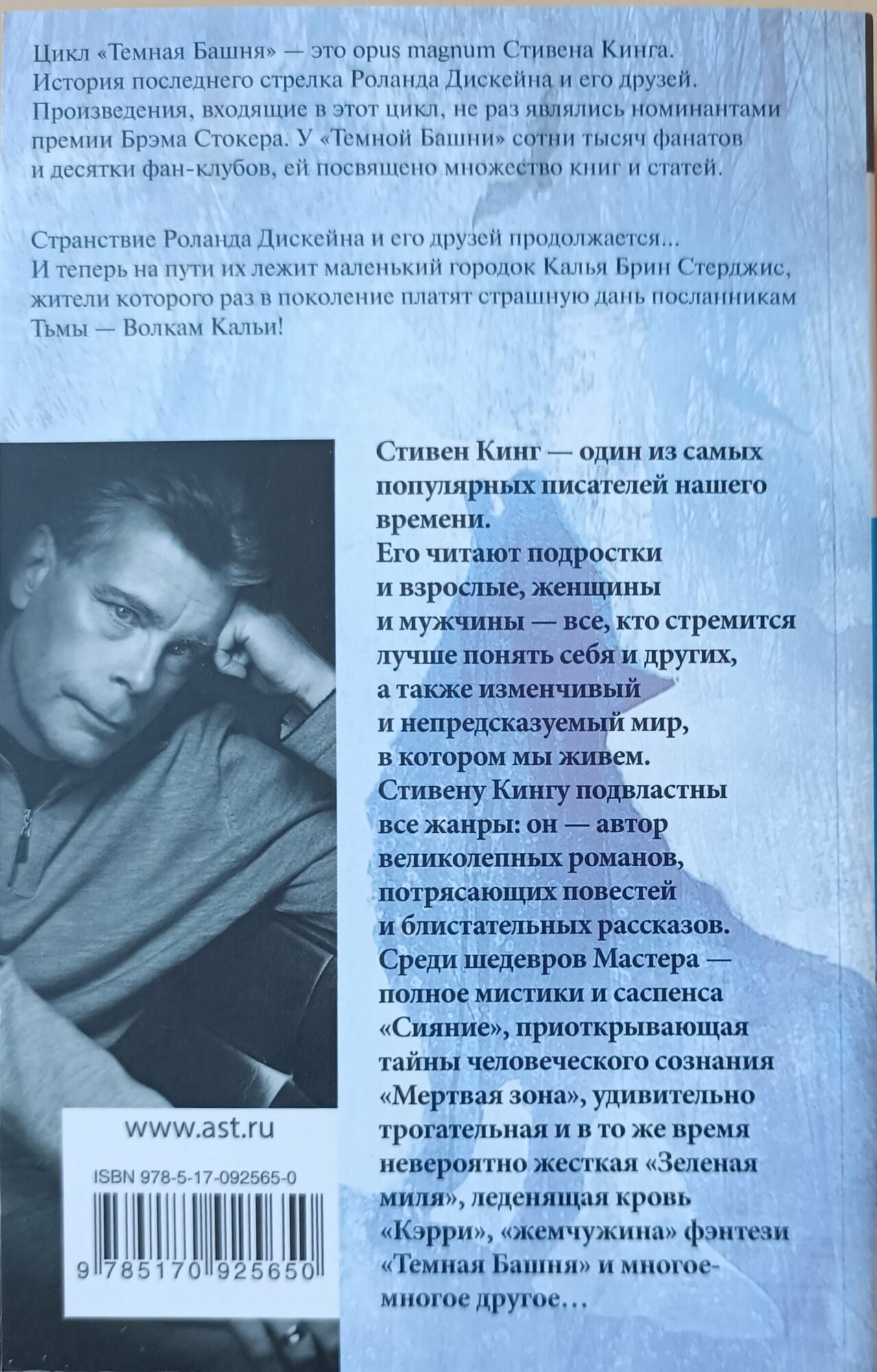 Я думаю, если вы сюда зашли - то знакомы с циклом "Темная башня". Кинг - прекрасный современный автор, я с радостью и интересом читаю его романы. Перед нами мягкая обложка, правда, я думала, что твердая - по цене. Слишком уж цены выросли... Раньше такую цену просили за твердый переплет...