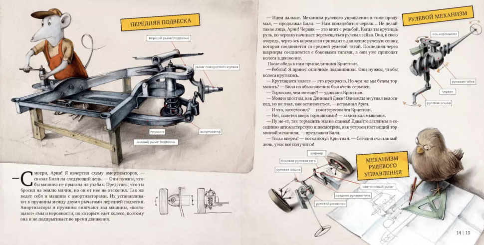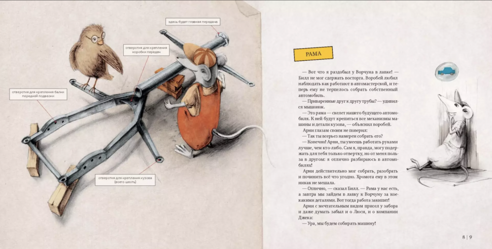 Трое друзей - мышонок Арни, воробей Билл и лягушонок Кристиан - решили собрать собственный автомобиль. С какими сложностями им пришлось столкнуться на пути к своей цели и как они со всем справились благодаря уму, находчивости, чувству юмора и, конечно, дружбе, вы узнаете из этой невероятной истории. А еще вместе с героями сказки вы разберетесь в том, как устроен автомобиль, и узнаете, для чего нужны его главные детали и механизмы - подвеска, амортизатор, сцепление, рулевой механизм, двигатель, тормозная система, система охлаждения и др.