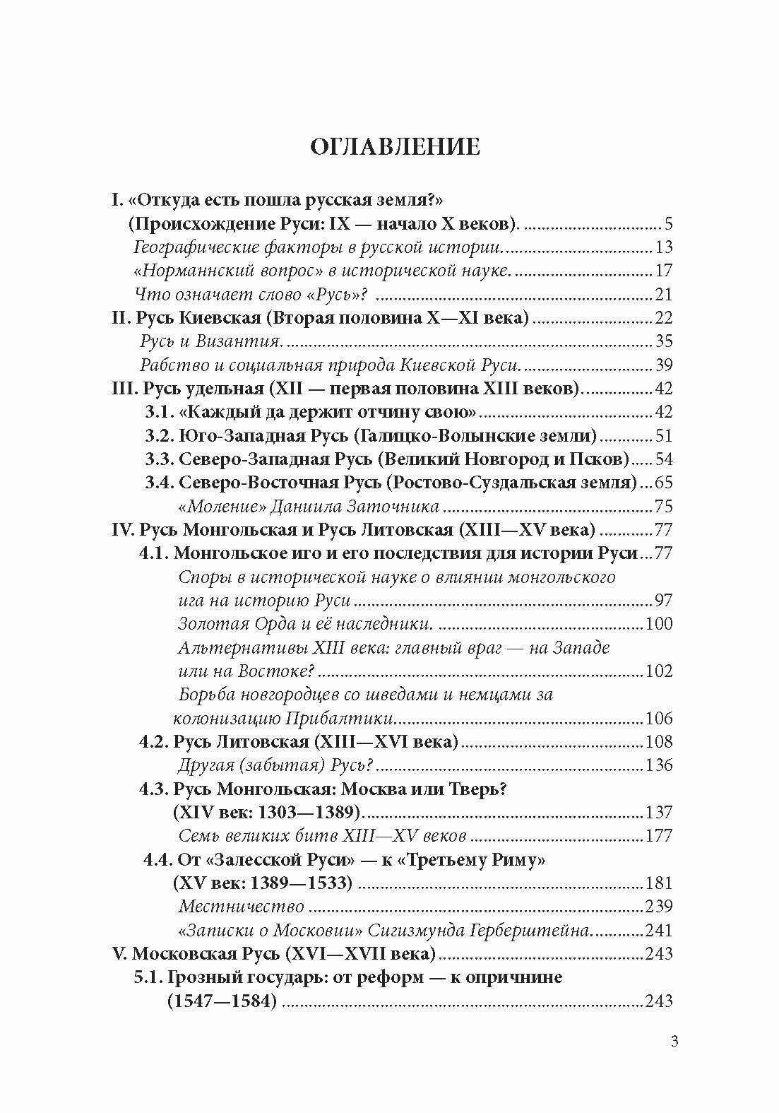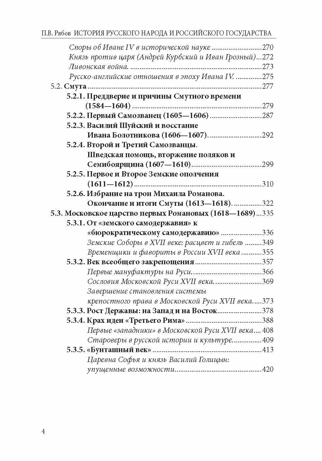 Изложение строится не столько как хронологически последовательный пересказ событий, дат и имён, сколько как исследование, основанное на проблемном принципе, фиксируя ключевые дискуссионные вопросы истории России от призвания варягов до начала ХХ века. Даётся авторская трактовка главных процессов и противоречий истории, упущенных возможностей и историографических споров. "Норманнская проблема", борьба Москвы с Тверью и Литвой за гегемонию на Руси, последствия монгольского ига, оценка эпох Ивана IV и Петра I, проблема ускоренной модернизации России, генезис и последствия крепостного права и церковного раскола, столкновение государственного деспотизма и народной вольницы, взаимосвязь повторяющихся реформ и контрреформ в самодержавной империи, феномен русской интеллигенции и истоки революционного движения - вот некоторые важнейшие темы, стоящие в центре исследования П.В. Рябова.