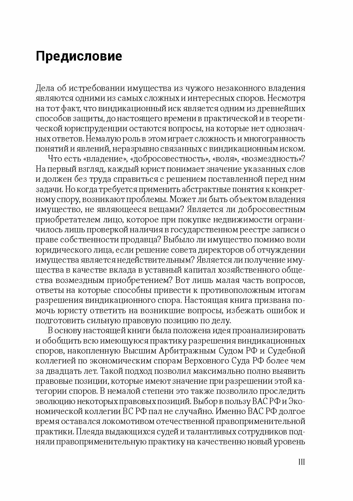 В основе книги лежит идея проанализировать и обобщить всю практику разрешения виндикационных споров, накопленную ВАС РФ и СК по экономическим спорам ВС РФ более чем за двадцать лет, и максимально полно выявить правовые позиции, которые имеют значение при разрешении этой категории споров.