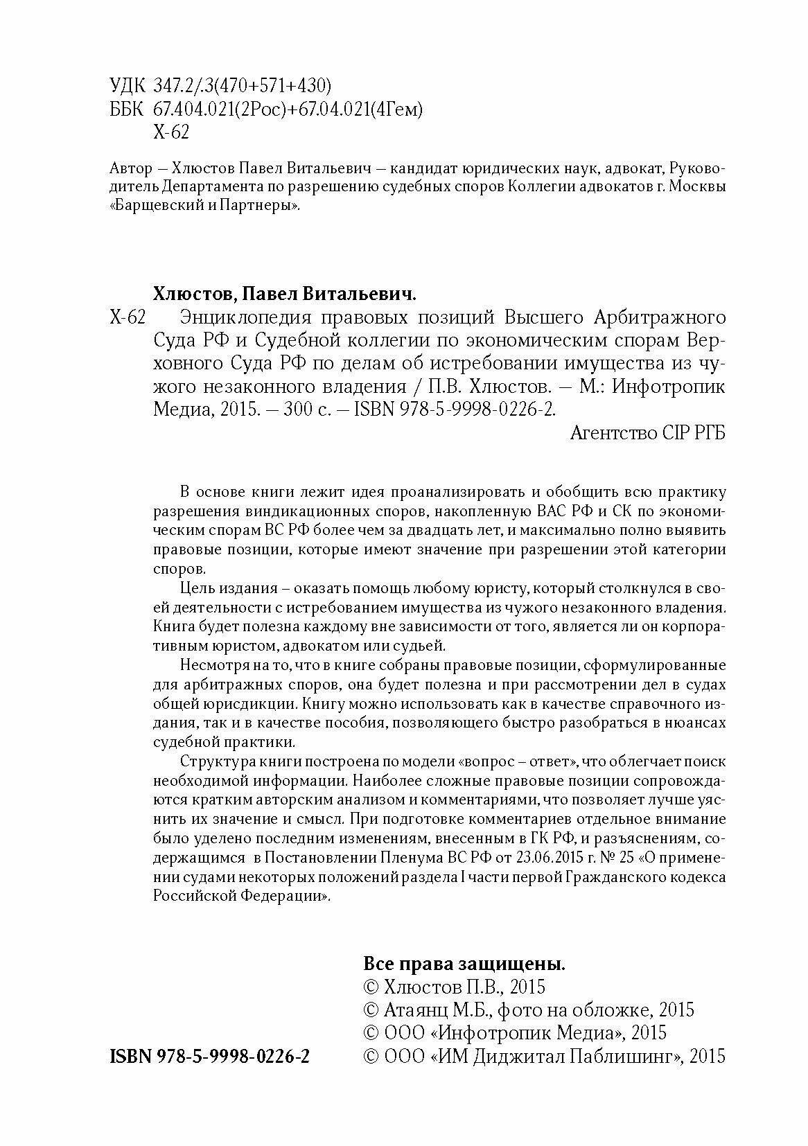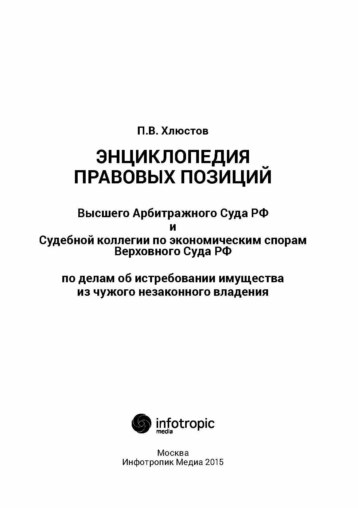 Энциклопедия правовых позиций Высшего Арбитражного Суда РФ и Судебной коллегии по эконом. спорам (Хлюстов Павел Витальевич); Инфотропик, 2015