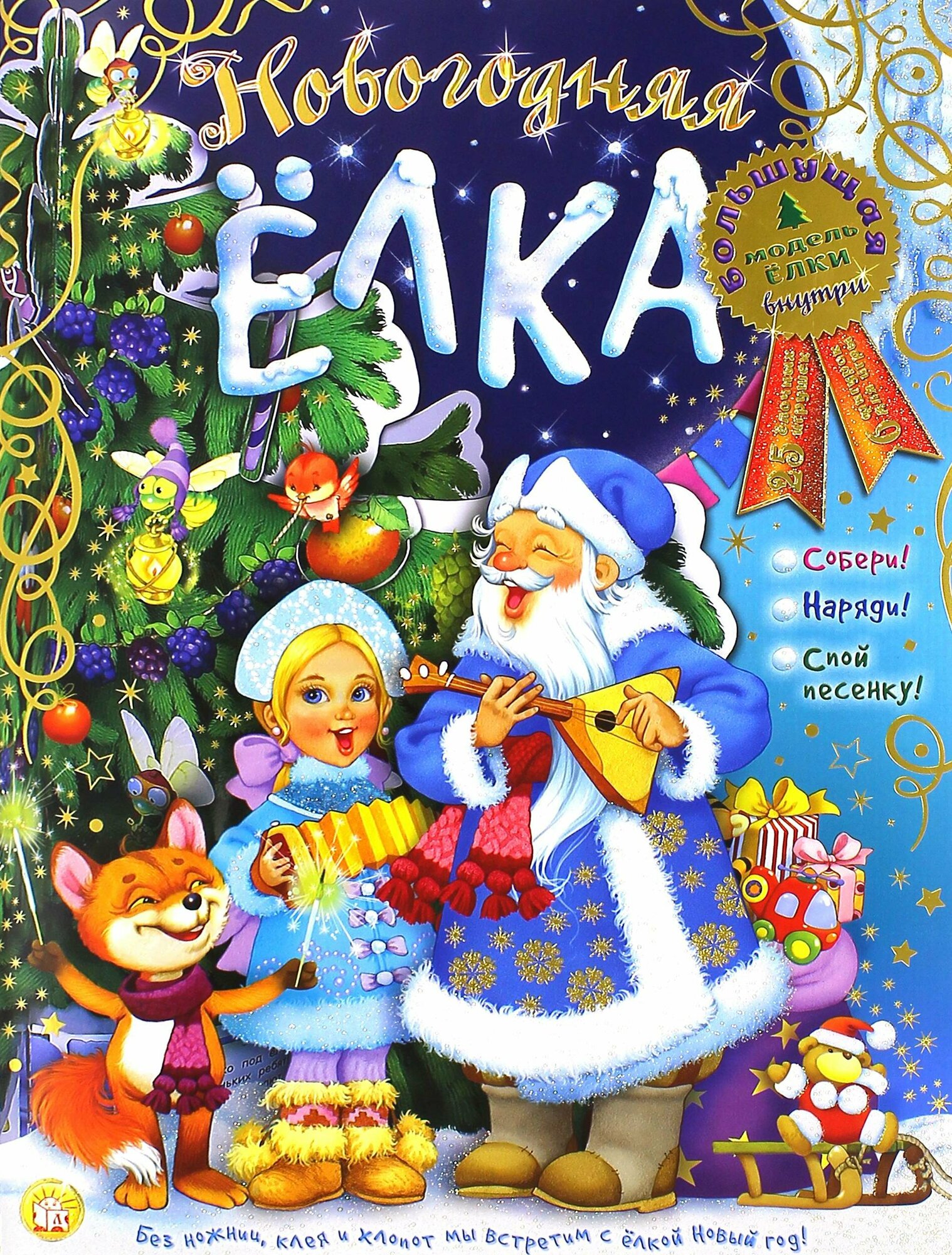 Будет отличный новогодний подарок для группы в детском саду! Елка огромная, к ней фигурки и стихи, все легко выдавливается и собирается (никакой возни с ножницами). На обложке - новогодние блестки, под обложкой - милые звериные мордашки.