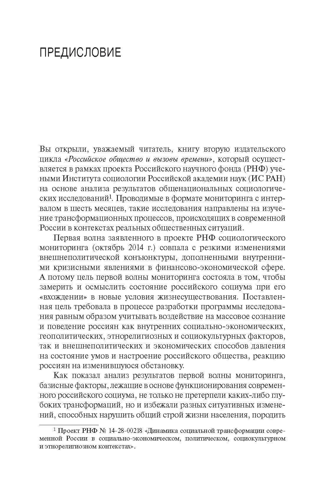 В книге представлен многоаспектный анализ второй "волны" общенационального социологического мониторинга состояния и динамики российского общества в контексте вызовов и угроз, обусловленных как воздействием внешнеполитических событий и процессов, так и влиянием экономического кризиса на повседневную жизнь российских граждан. Рассматриваются особенности социально-психологического состояния общества, установок экономического поведения, духовно-нравственные и этнорелигиозные ориентации россиян в кризисных условиях, выделяются ситуативные и базисные факторы, определяющие общий настрой российского социума на переломном этапе его исторического развития. В целях сопоставительного анализа используются данные многочисленных общенациональных социологических исследований, проведенных в предшествующие годы российских реформ.