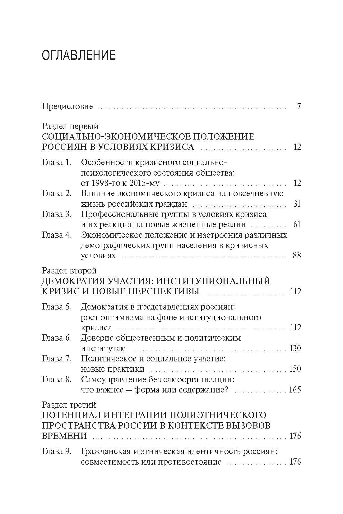 Эта книга дает социологический срез российского общества в самый разгар прошедшего кризиса, в 2015 году. Характерно, что авторы книги обозначали этот кризис как 2014-2015 гг., - они не подозревали, что он затянется и до 2016 г. Очень ценная книга для компоративистских исследований! Много графиков и таблиц.