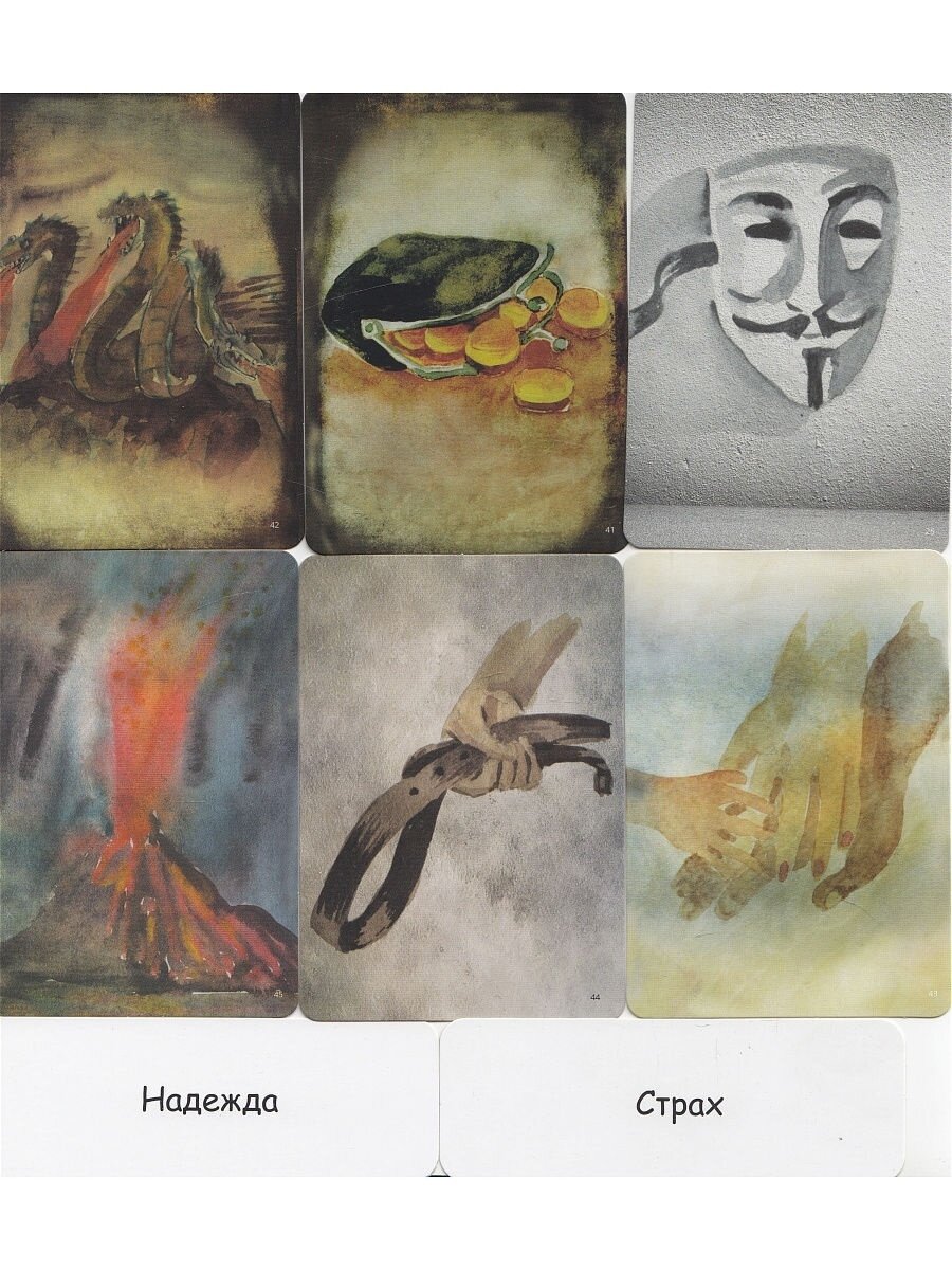 Качество карт высокое, картинки все яркие, некоторые светлые и позитивные, некоторые темные, тяжелые для восприятия. Хорошо подходят как при работе с травмой, конфликтами, так и ресурсным состоянием. Также дополнительно к картам есть слова и фразы, которые делятся на ресурсные и не очень.