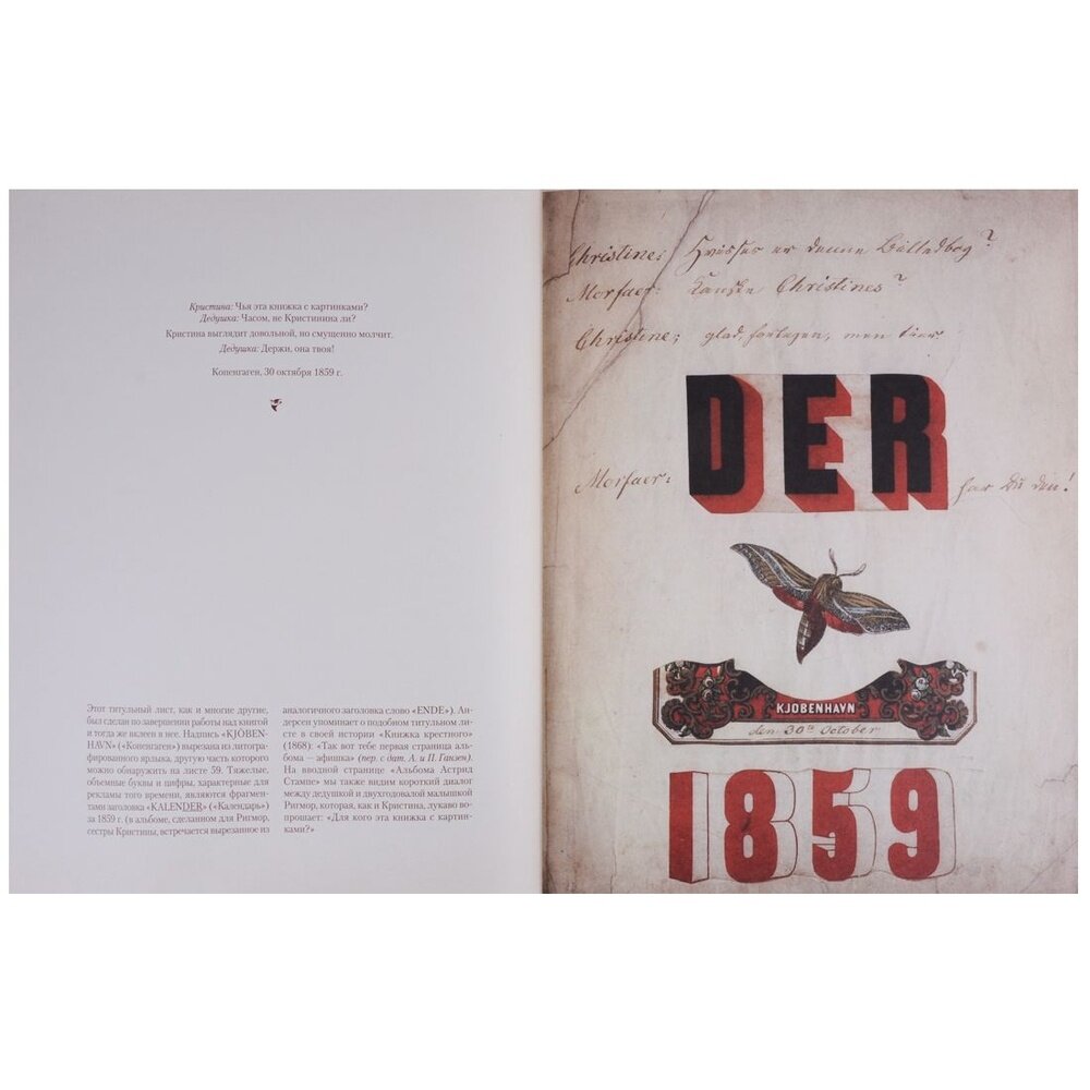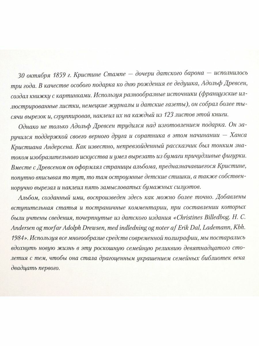 Датское королевство славится обилием старинных господских усадеб. Много лет тому назад в одной из них жила маленькая девочка по имени Кристина. Малышка была внучкой датского барона Хенрика Стампе и известного судьи Адольфа Древсена – близкого друга великого датского сказочника и непревзойденного рассказчика Ханса Кристиана Андерсена. Х.К Андерсен умел вырезать из бумаги причудливые фигурки, о каждой из которых для слушателей у него была припасена целая история. Малышка Кристина, как и все дети, очень любила истории «милого Андерсена»; он же знал их превеликое множество, длинных и коротких. А еще Андерсен частенько дарил детям своих друзей собственноручно изготовленные им «книжки с картинками». Он брал чистую тетрадь и принимался наклеивать в нее изображения, вырезанные из книг и журналов; если же для задуманной композиции картинок не хватало, он рисовал их сам или вырезал из бумаги силуэты сказочных персонажей. Дети были в полном восторге от таких подарков! Однажды Кристина, сидя на коленях у дедушки Древсена, мечтательно вздохнула: «Ах, как бы и мне хотелось иметь такую книжку!» Сказано – сделано! 30 октября 1859 года, в день своего рождения,