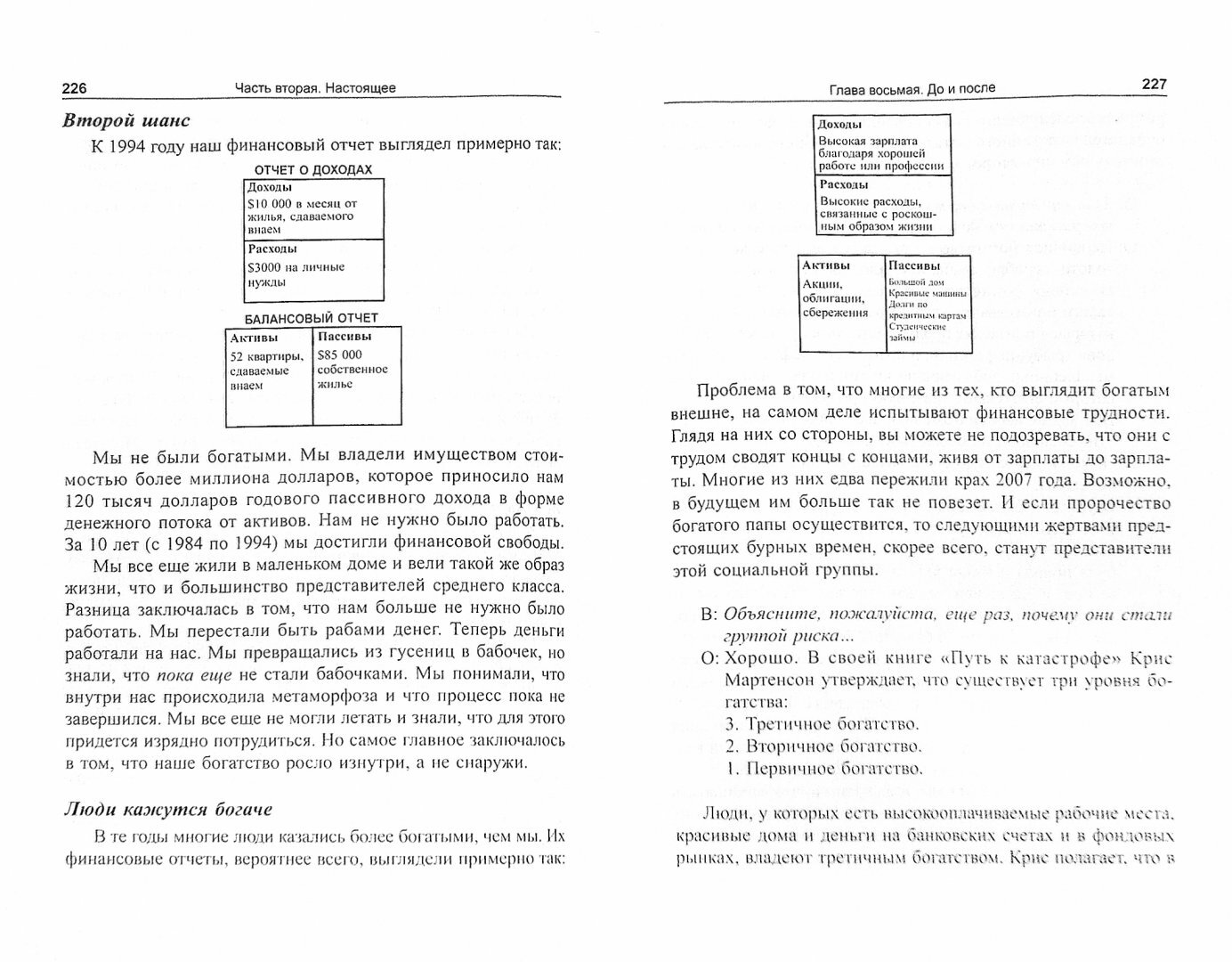 Кийосаки в очередной раз написал проницательную и отрезвляющую книгу о финансах. Хотя порой его книги совсем не о деньгах, а о самосознании, которое и влияет в итоге на финансы человека. На первый взгляд идеи Роберта выглядят дико. Из-за того, что никто не высказывал их раньше. "Долги могут сделать человека богаче, а работа беднее". Во что надо вкладывать деньги обычному человеку? В недвижимость и на сберегательный счёт, если он рассчитывает не становится богаче.