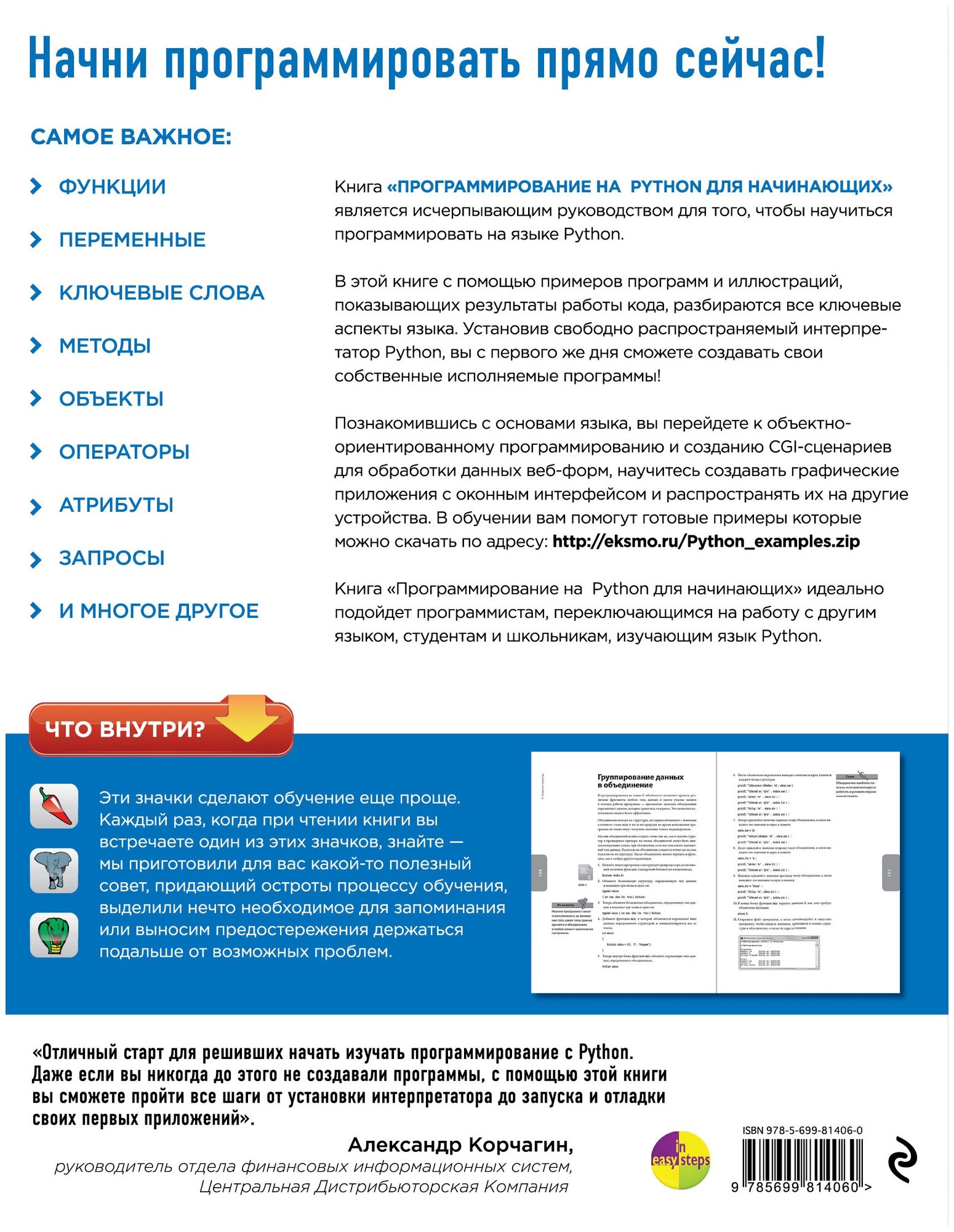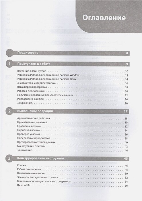 Содержание книги действительно соответствует названию. Это издание для желающих изучать Python с минимальным опытом и навыками программирования. Ценность данной книги для начинающего программиста в том, что она дает минимальный обзор на многие технологии - ООП, WEB, разработку форм. Материал подан не занудно, читается легко, сопровождается простыми примерами.