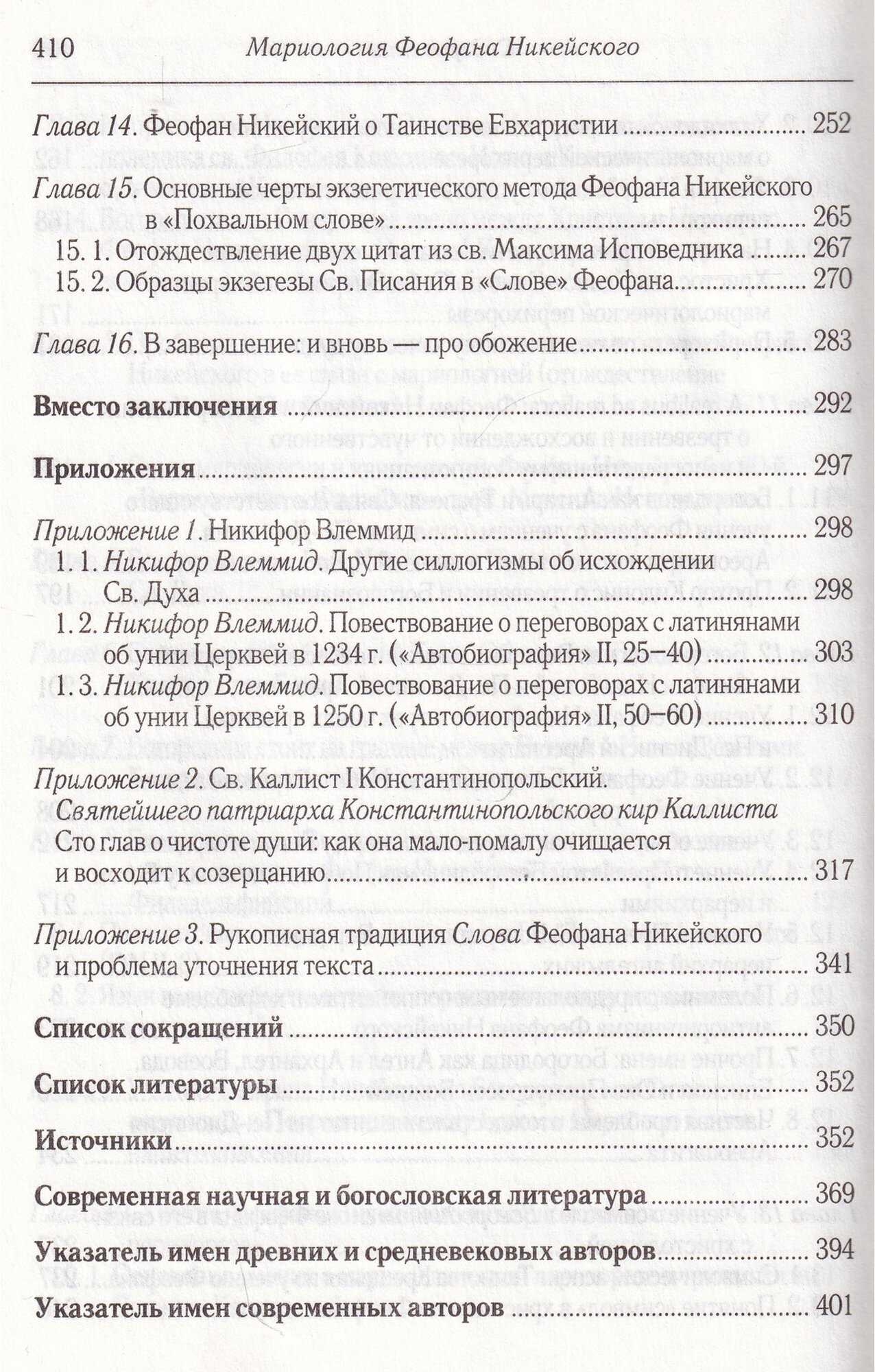 В приложении публикуются переводы богословских трактатов Никифора Влеммида (ок. 1197-1269) и св. Каллиста I, патр. Константинопольского (1350-1353, 1355-1364), а также сравнительный анализ текста "Похвального слова" по московской рукописи (Sup. Gr. 461, ff. 1-77).